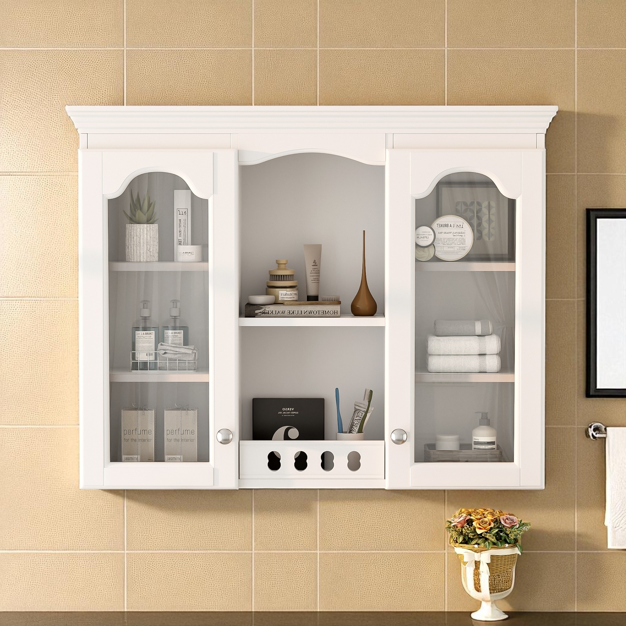 Wall Mounted Medicine Cabinet, Bathroom Wall Cabniet with Middle Storage Shelves, 2 Side Glass Doors and Adjustable Shelves
