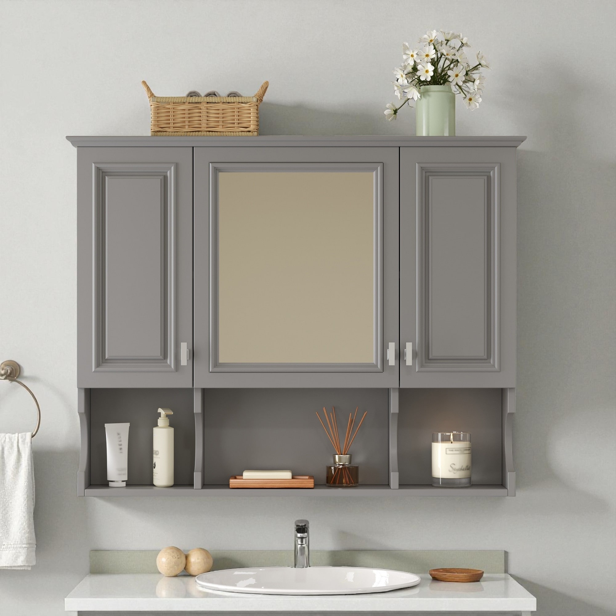 35 Inch Bathroom Mirror Cabinet, Wall Mounted Medicine Cabinet with 3 Doors and Open Shelves, Modern Storage Organizer