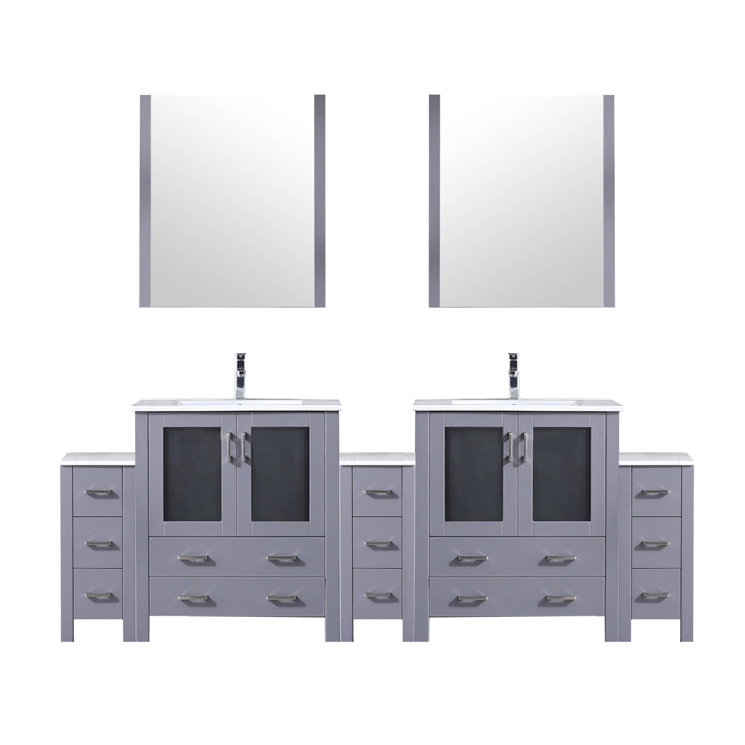 Dark Grey Double Bath Vanity 96 in. W x 18.25 in. D, with Side Cabinets, White Ceramic Top, 28 in. Mirrors, and Faucet Set
