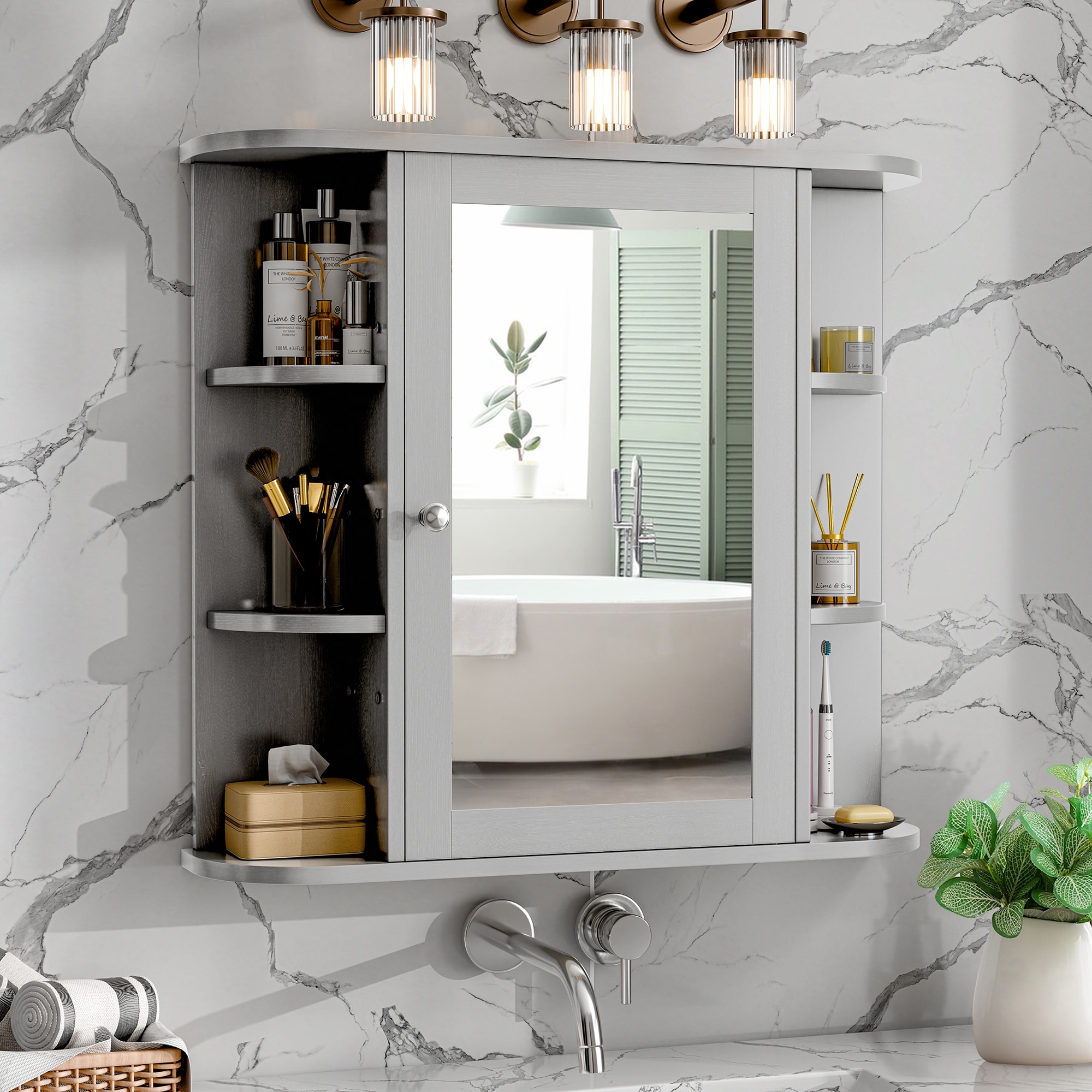Arched Glass Door Mirrored Medicine Cabinet Wall Mounted Storage Cupboard with 3 Open Shelf