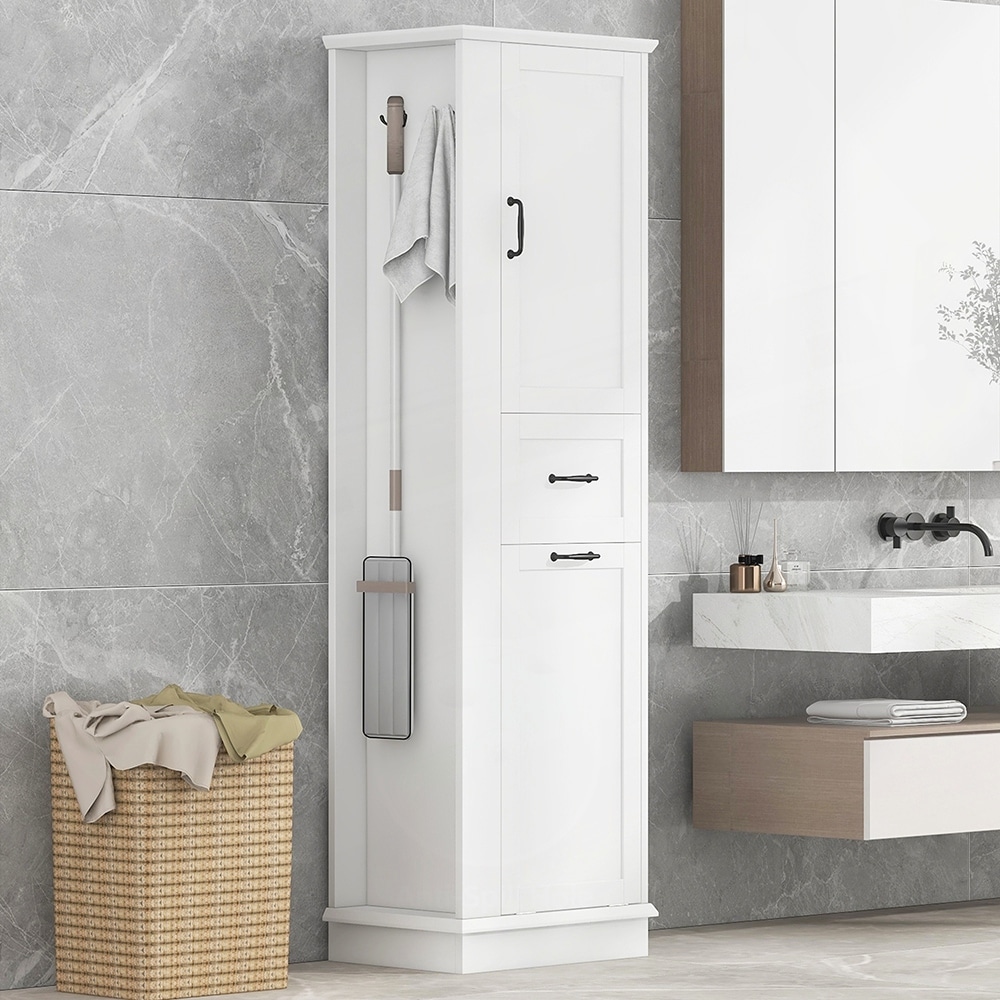 Tall Freestanding Bathroom Storage Cabinet with Adjustable Shelves,Hooks,and Anti-Toppling Device