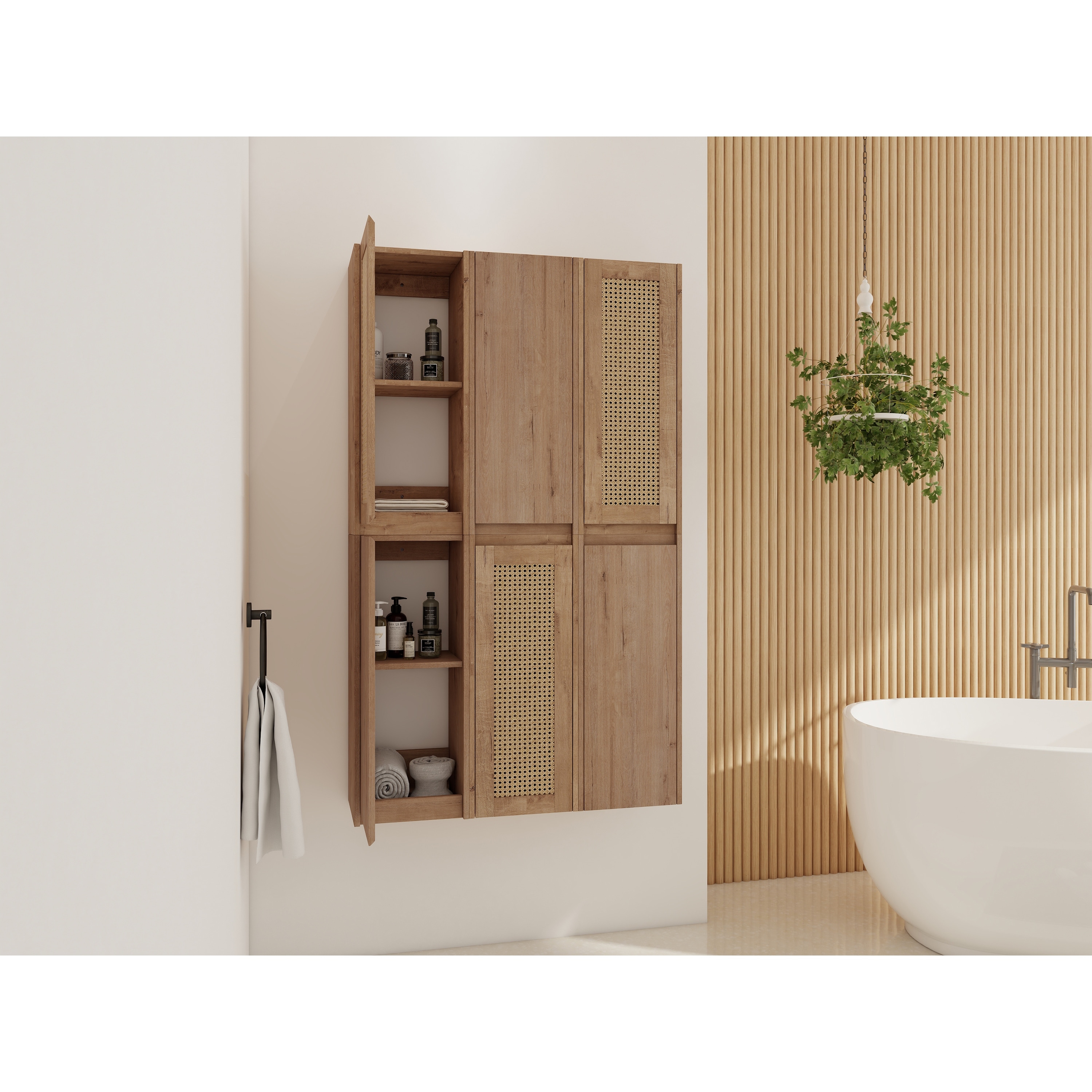 6 Door Bathroom Side Cabinet Wall Mounted Storage Cabinet Floating Wall Cabinet Towel Organizer Cabinet with Rattan Door