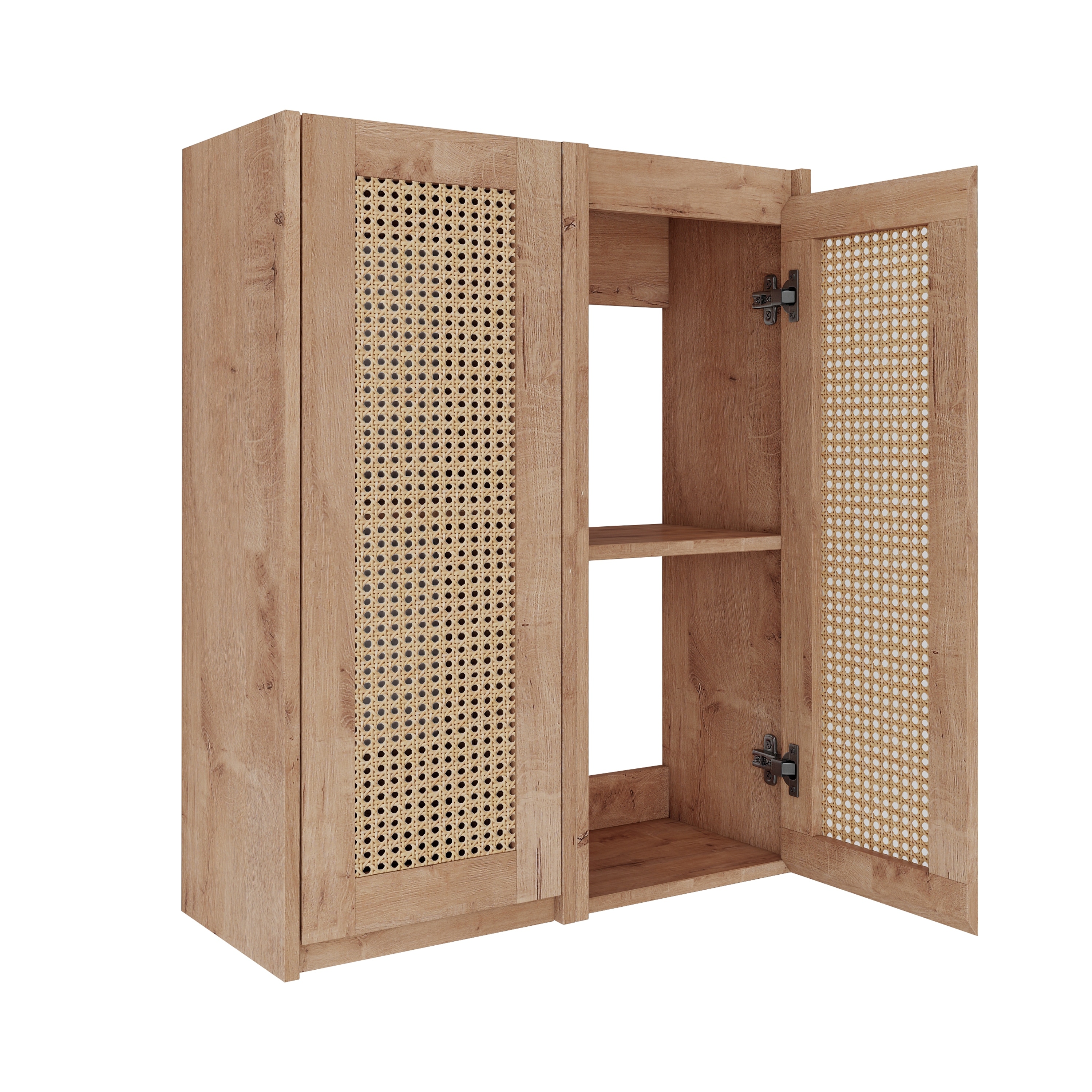 2 Rattan Door Bathroom Side Cabinet, Floating Wall Mounted Storage Cabinet with Shelves Towel Organizer Rack wSoft-Close Hinge
