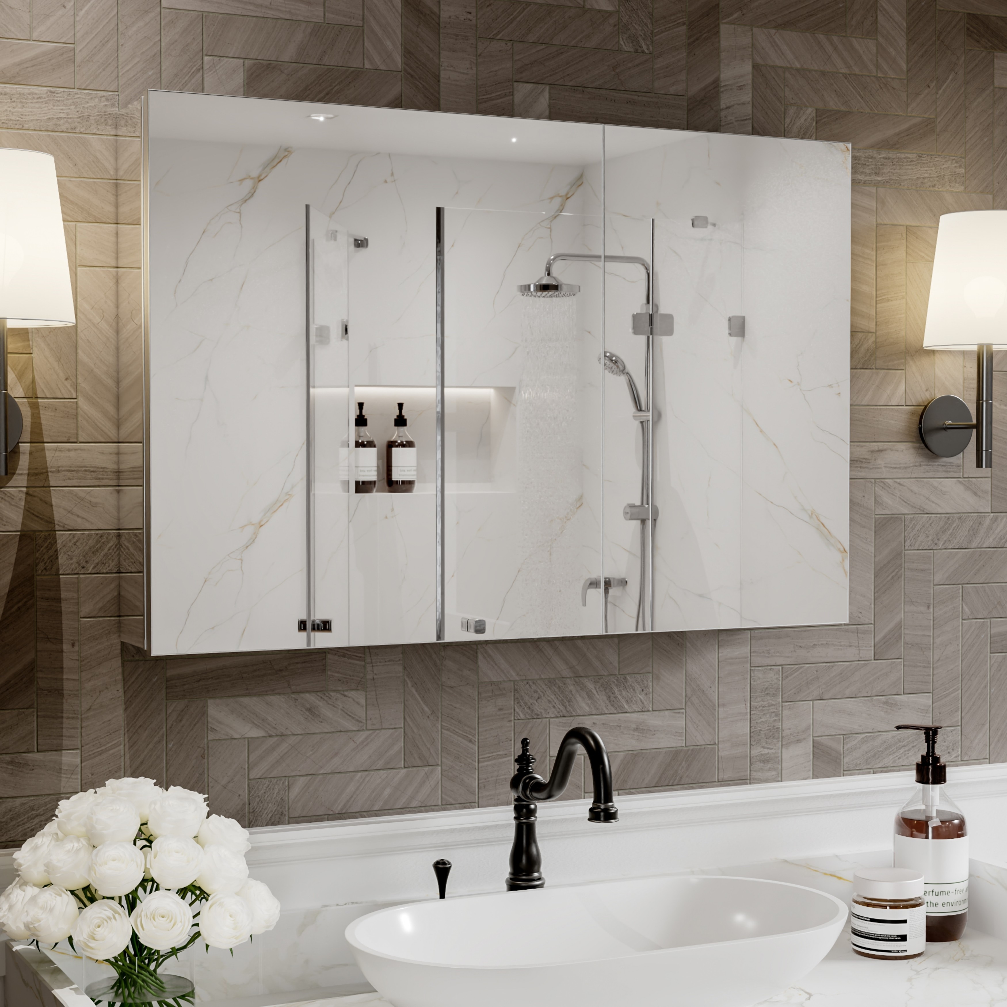 36x30 in Mirrored Medicine Cabinet, Dual-Swing, Tri-View, Copper-Free, Blum Soft-Close, Recessed/Surface, Chrome Aluminum