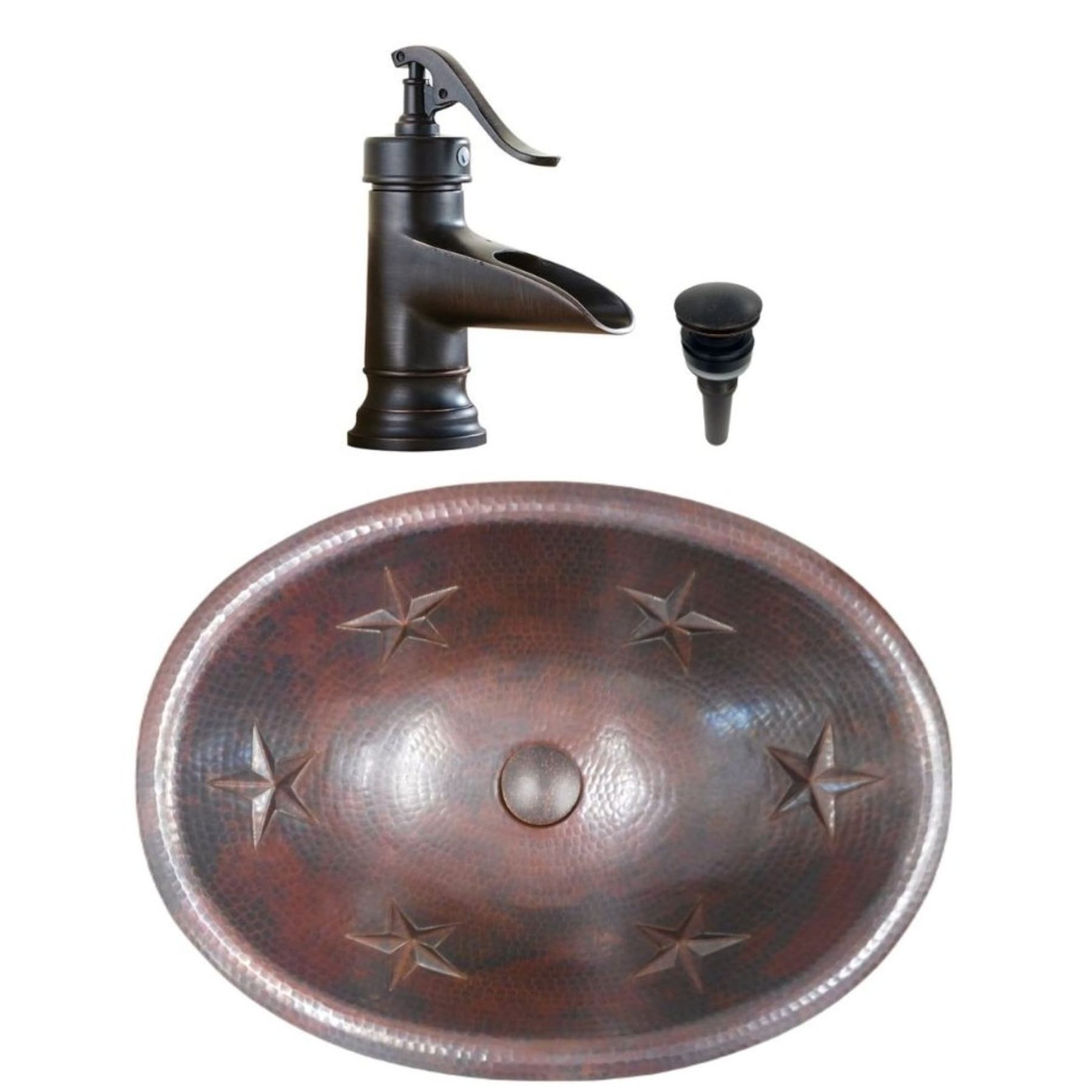 19" Oval Copper Bathroom Sink Texas Stars Design, Faucet Kit Included - 19" X 14" X 5.5"