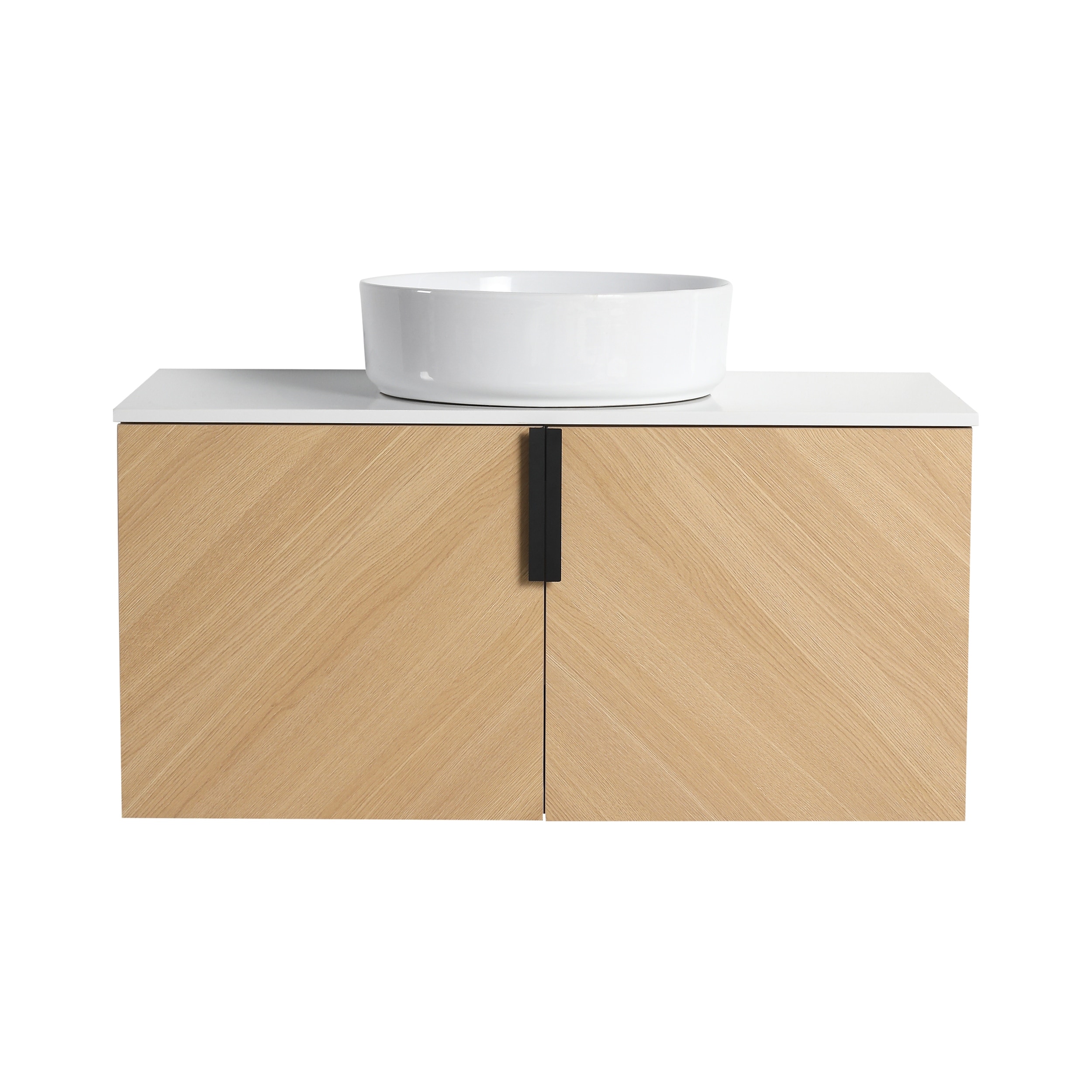 Wall-Mounted Bathroom Vanity, Light Oak with White Stone Slab and Sink