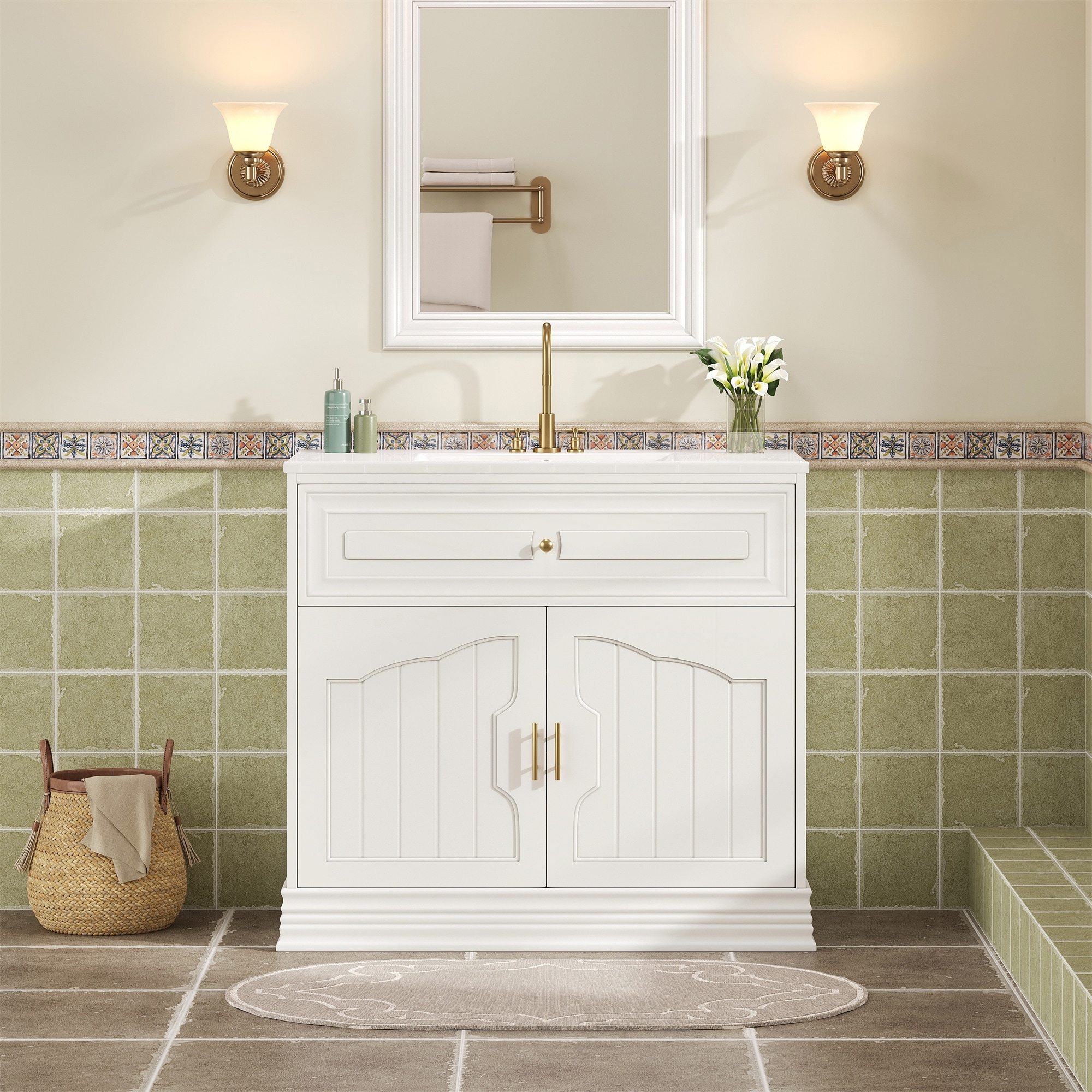 30" Freestanding Bathroom Vanity with Sink, Bathroom Cabinet, Ceramic Top with 3 Faucet Holes, 1 Door with Shelf & 3 Drawers