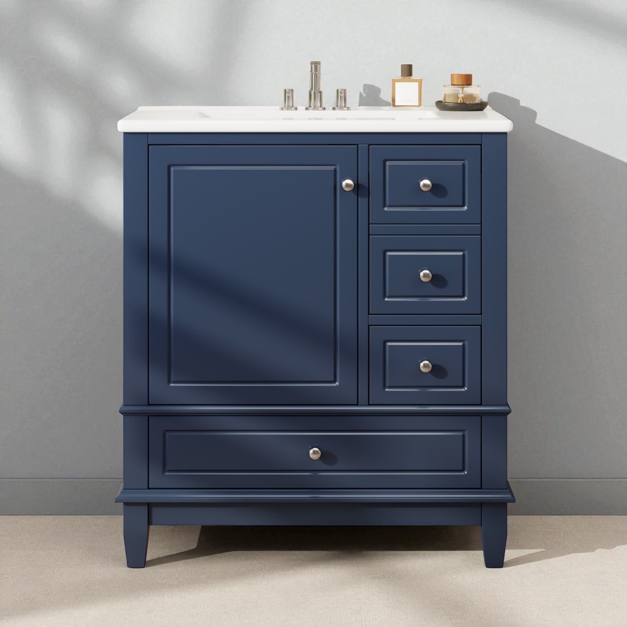 30" Freestanding Bathroom Vanity with Sink, Bathroom Cabinet, Ceramic Top with 3 Faucet Holes, 1 Door with Shelf & 3 Drawers