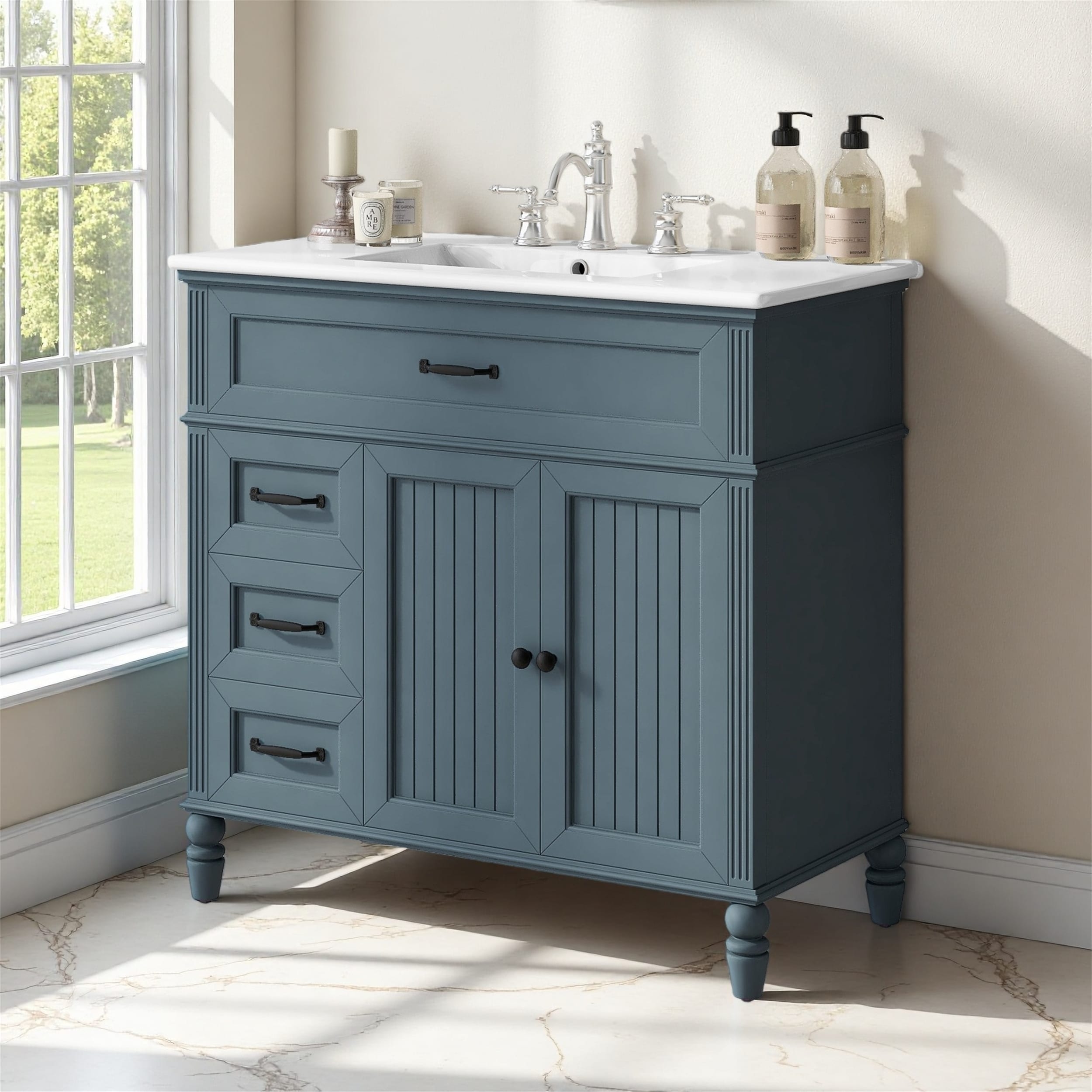 36" Bathroom Vanity with Ceramic Sink, Soft Close Doors, Adjustable Shelves, 3 Drawers