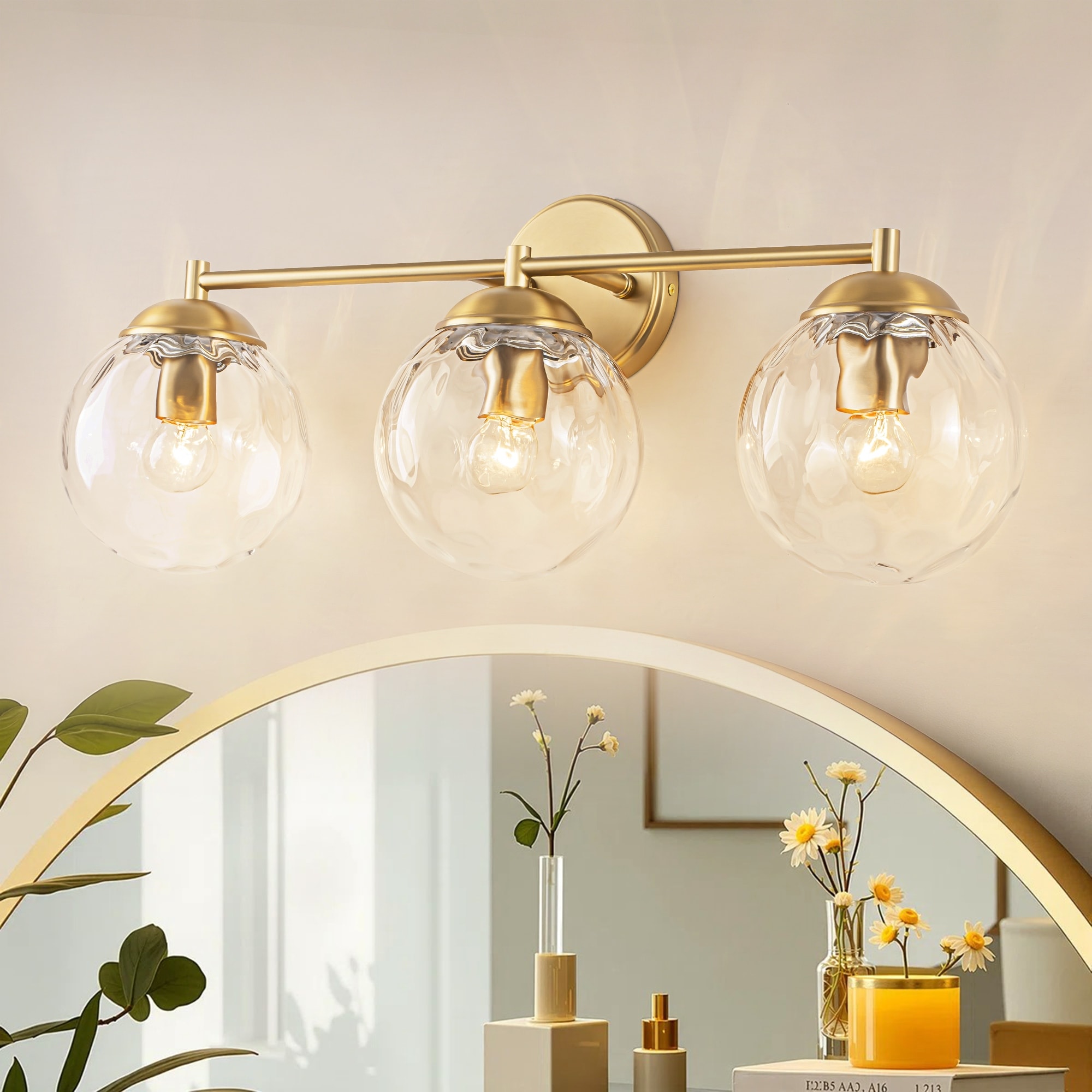 Rennnsan 24.4" 3-Light Brass Modern Linear Water Ripple Clear Glass Globes Bubble Bathroom Vanity Light