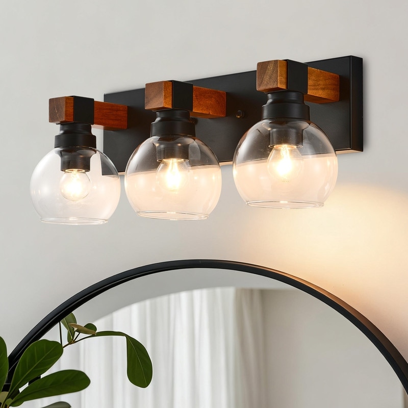5-Light Farmhouse Vanity Light, Rustic Black & Wood Wall Sconce with Glass Shades, Modern Industrial Style (Bulbs Not Included)