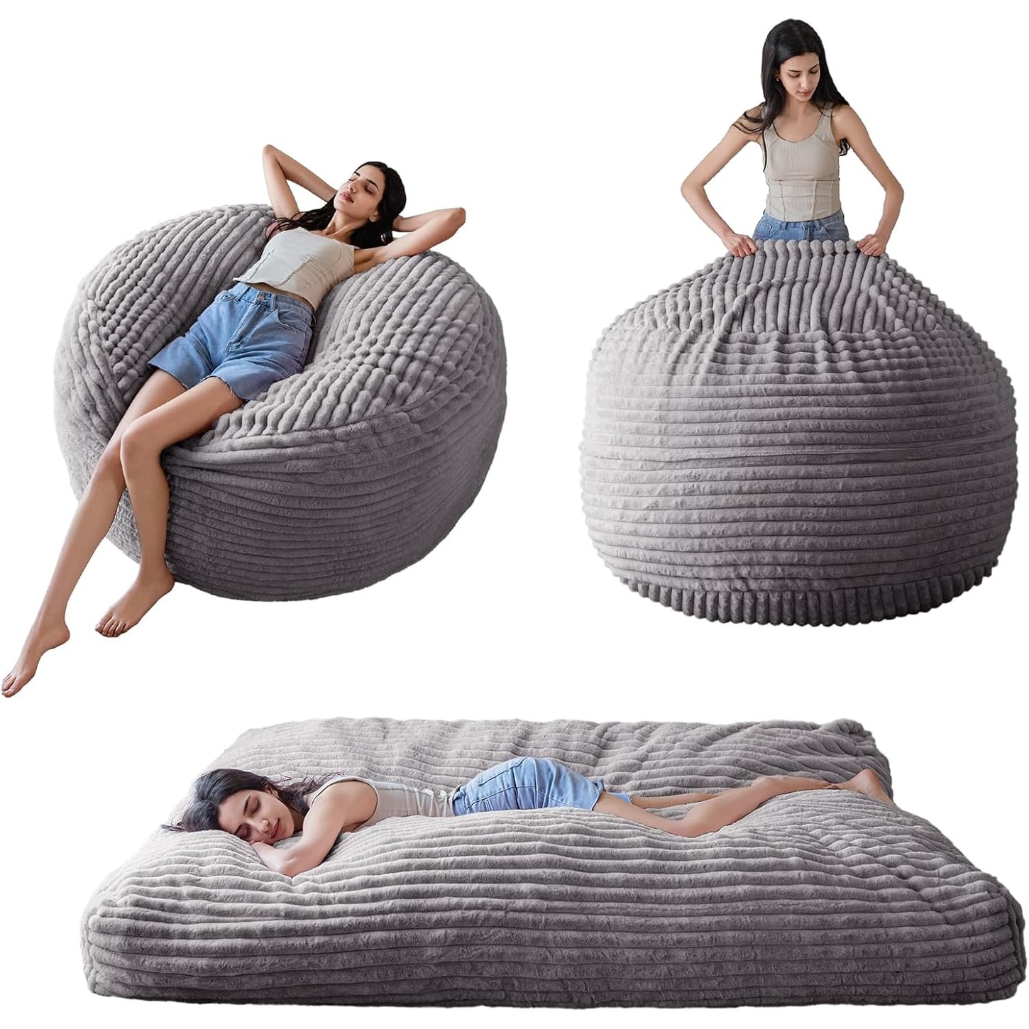 Giant 3-in-1 Bean Bag Chair with Washable Cover, Convertible Floor Cushion for Living Room - Chevron Plush Grey