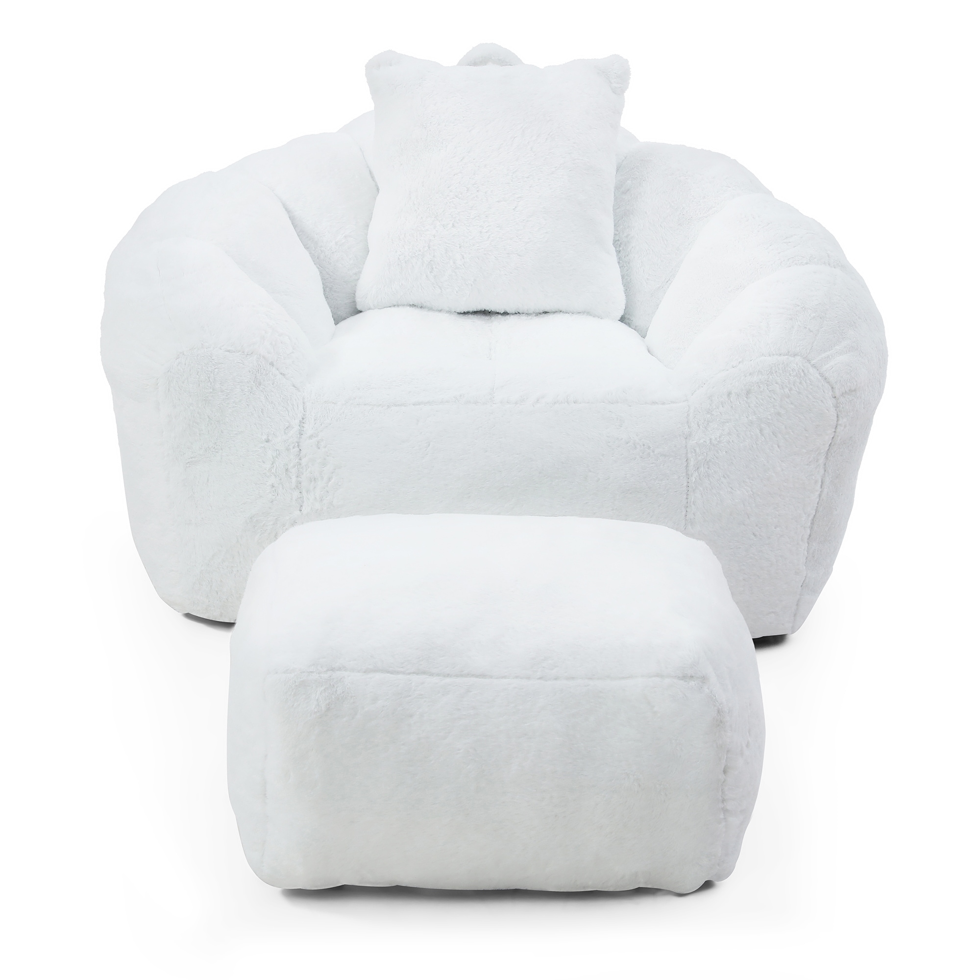 White Faux Fur Bean Bag Chair with Footstool High-Density Foam Ergonomic Lounge Chair for Living Room Bedroom Gaming