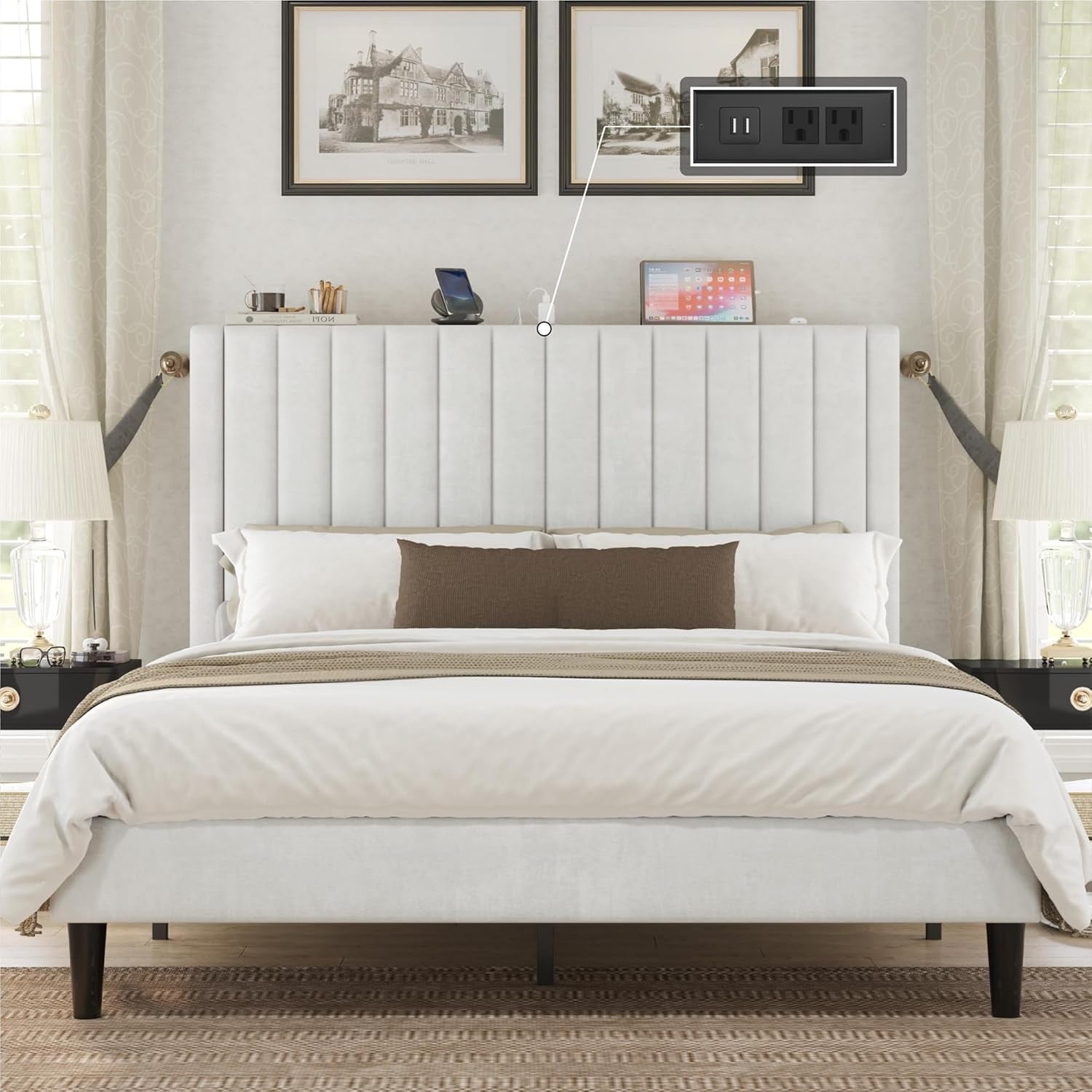 Queen Size Velvet Upholstered Platform Bed with Channel Tufted Headboard, Noise-Free, USB Charging, Easy Assembly