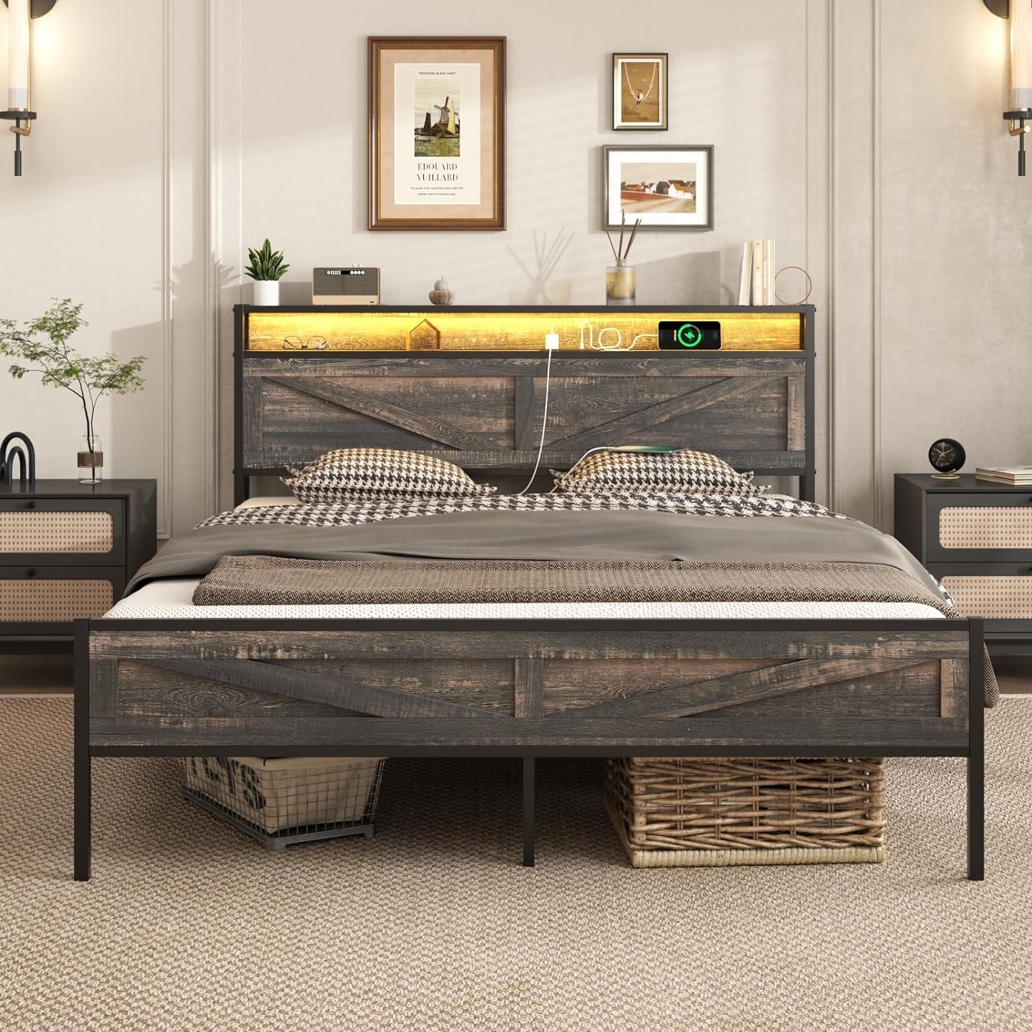 Industrial Queen Size Platform Bed with Charging Station, Storage Headboard, and Noise-Free Design