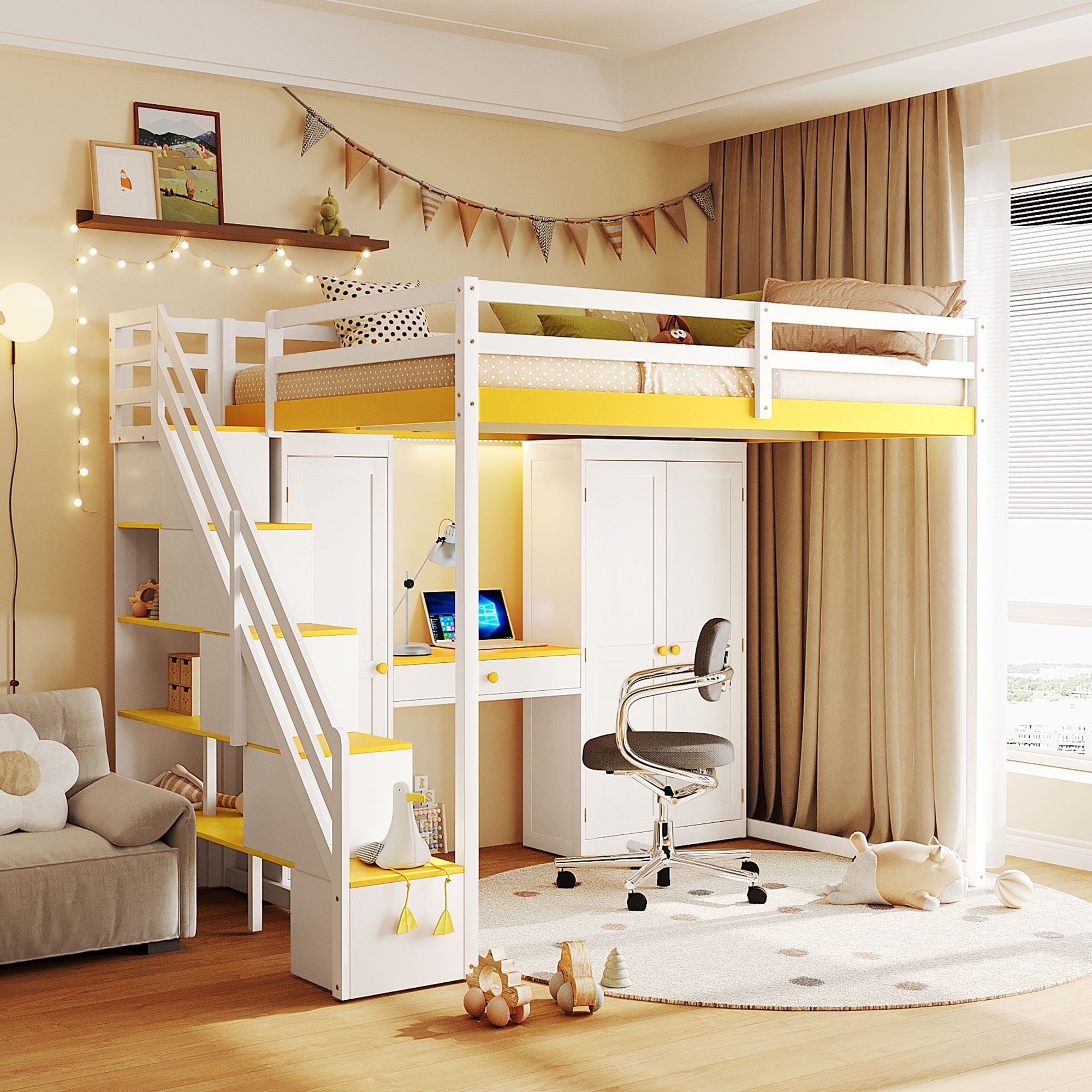 Full Size Loft Bed with Storage Staircase,Built-In Dressing Table with Mirror and Drawer,Wardrobe & Cabinets,USB Ports