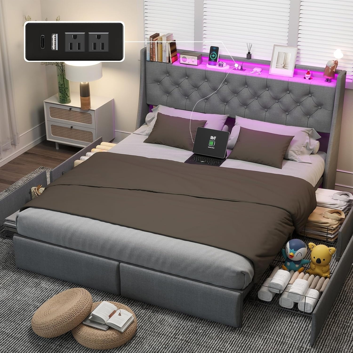 Queen Bed Frame with Storage Drawers, LED Headboard, Charging Station & Noise-Free Design, No Box Spring Needed