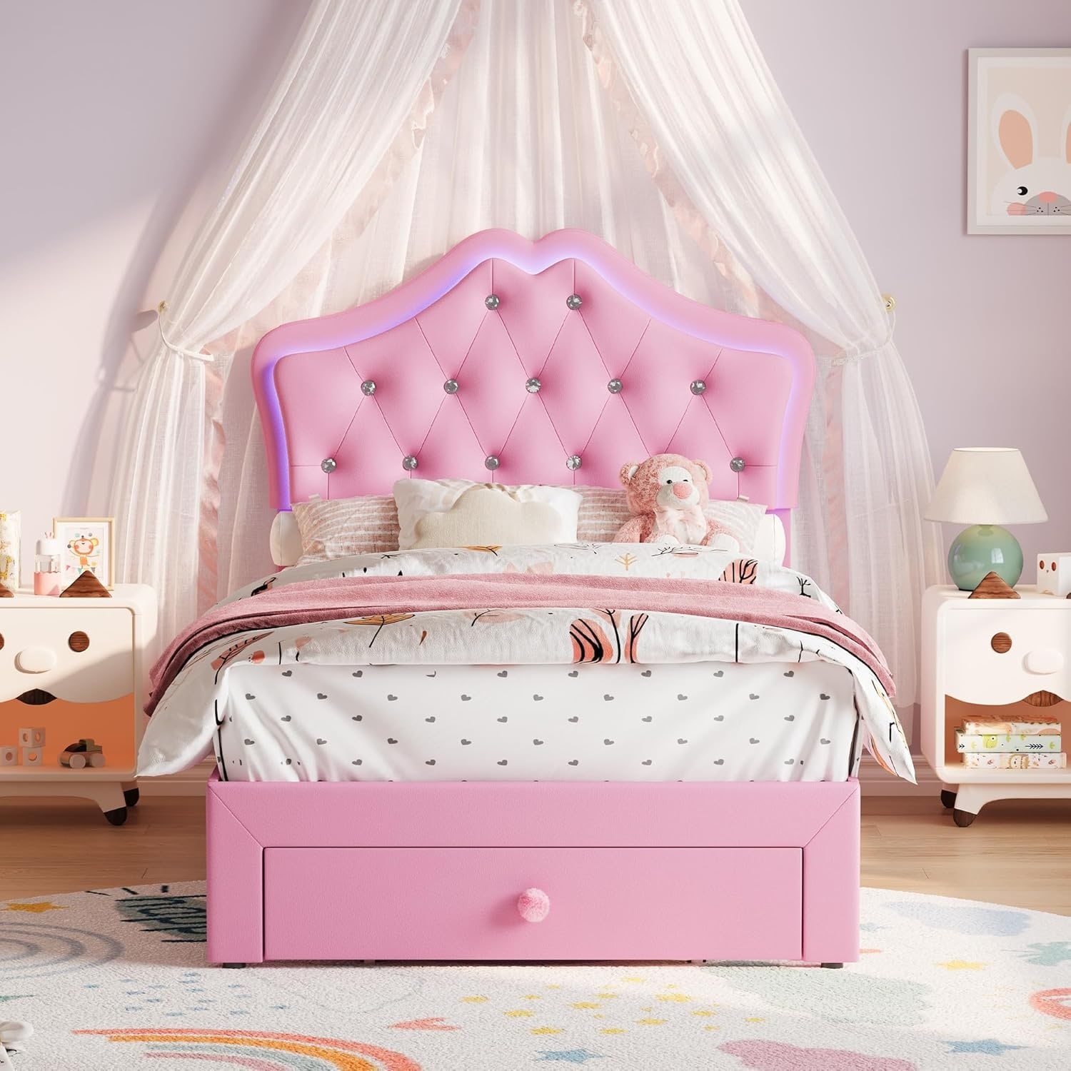 Twin Size Bed Frame with LED Lights, Upholstered Platform Bed with Storage Drawer