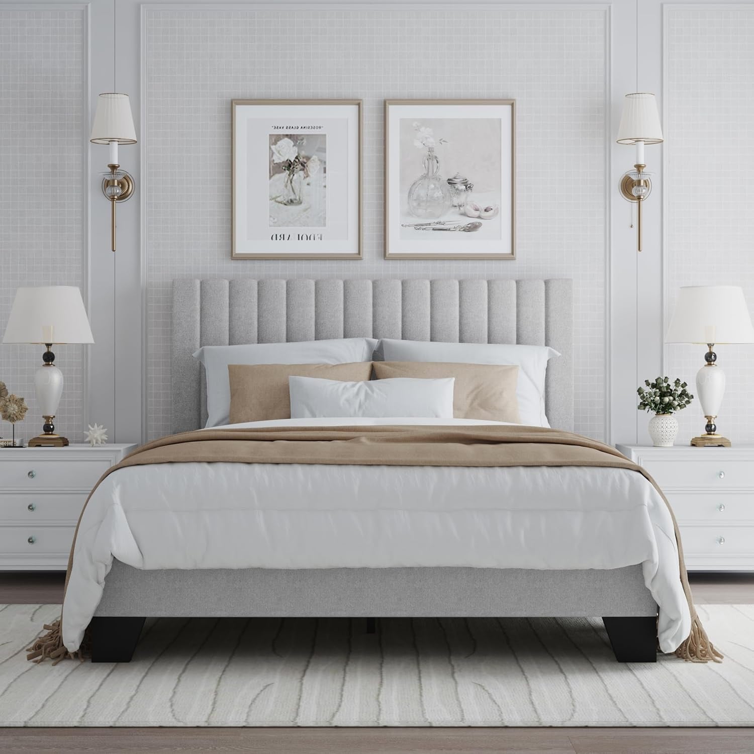 Full Size Bed Frame with Adjustable Tufted Headboard, Linen Upholstered Platform Bed, Noise-Free, Easy Assembly
