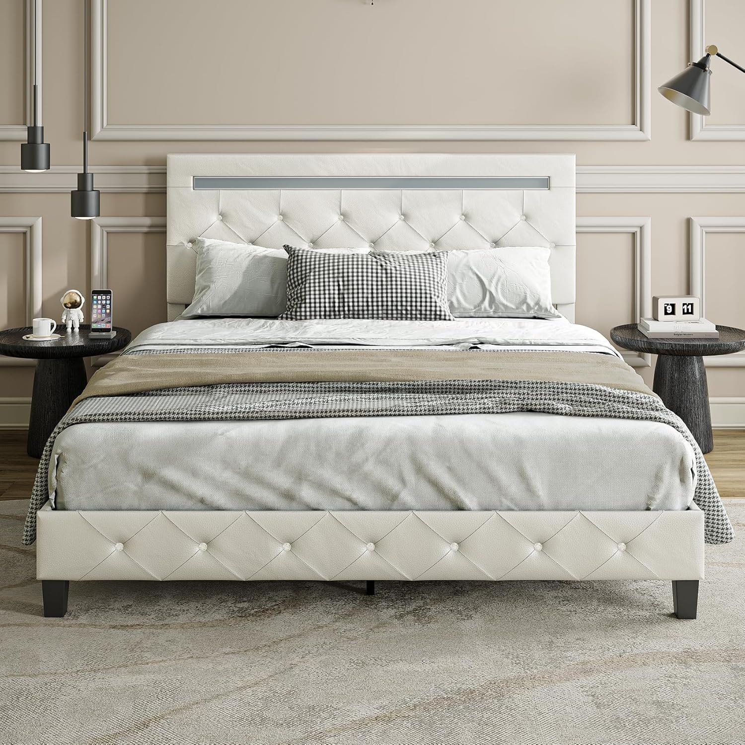 Full Size Bed Frame with LED Lights, Charging Station, Adjustable Headboard, Easy Assembly, No Box Spring Needed, White