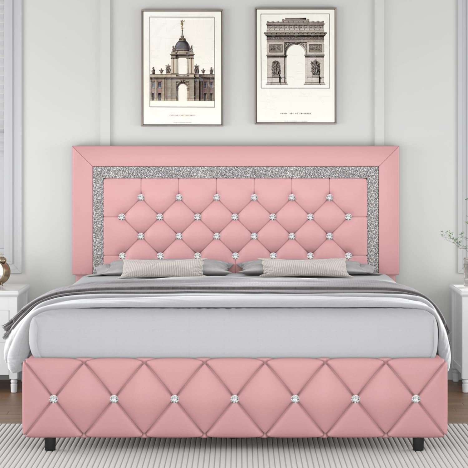 Pink Faux Leather Queen Platform Bed with Diamond Headboard, Wooden Slats Support, No Box Spring Needed, Easy Assembly
