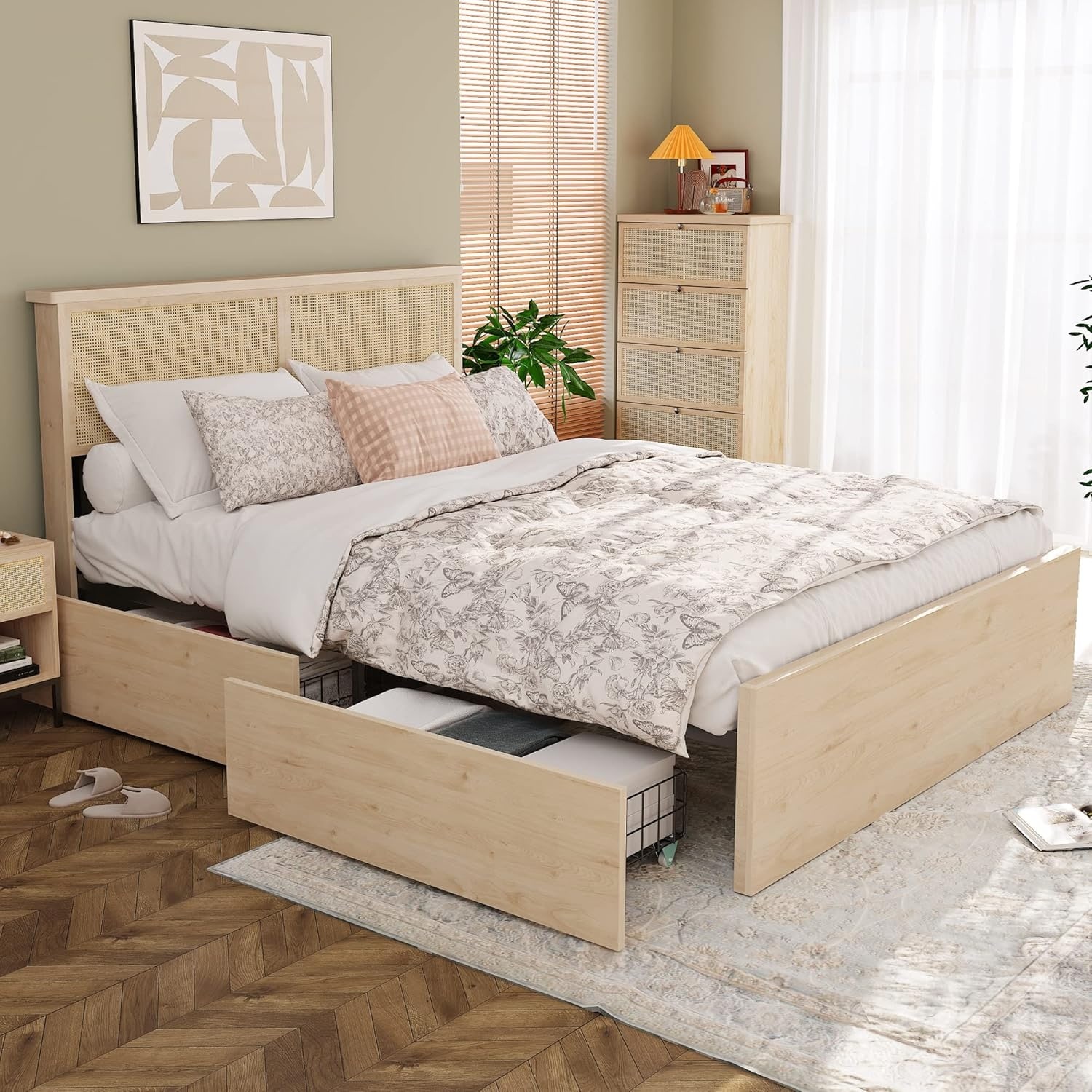 Queen Bed Frame with Rattan Headboard, 4 Storage Drawers, Metal Platform, No Box Spring Needed
