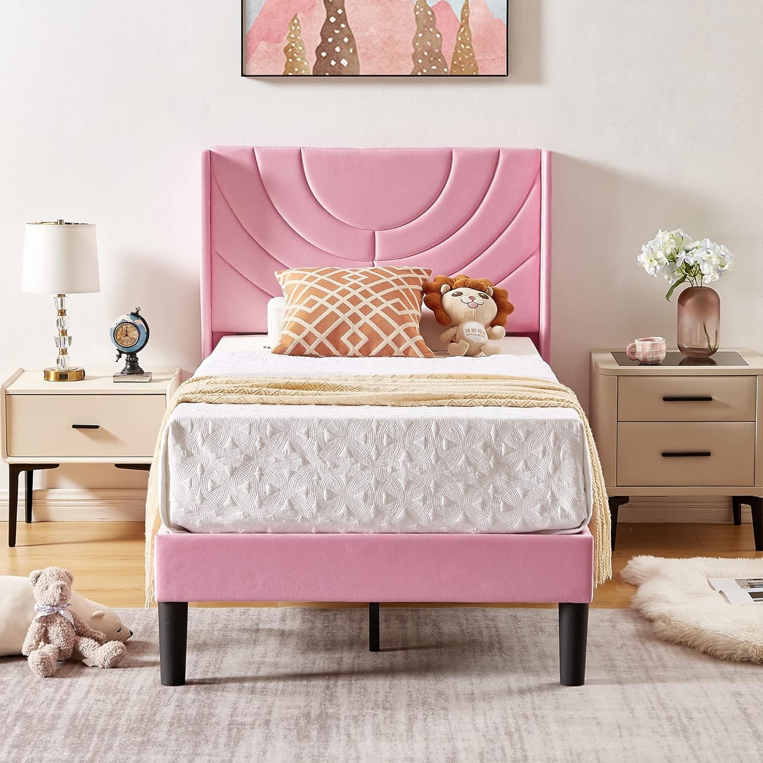 Twin Size Velvet Upholstered Platform Bed Frame with Fabric Headboard, Wooden Slats Support, No Box Spring Needed, Pink