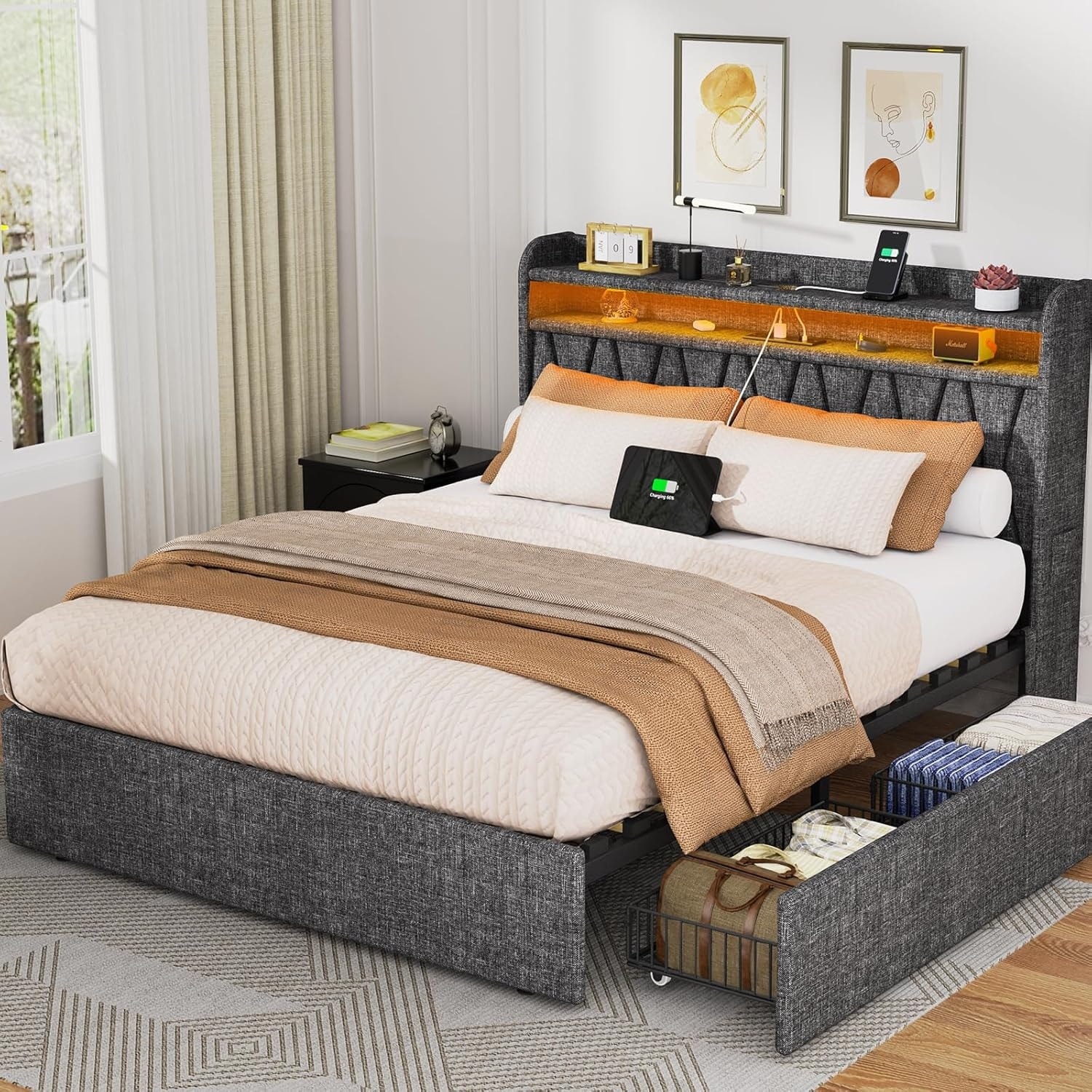 Queen Bed Frame with Storage Drawers, LED Headboard, USB Charging, Wooden Slats, Noise Free, Easy Assembly