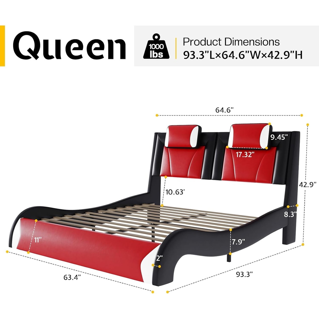 Modern RGB LED Queen Bed Frame with Wave Design, Faux Leather Upholstered Headboard, Noise-Free Structure, Easy Assembly