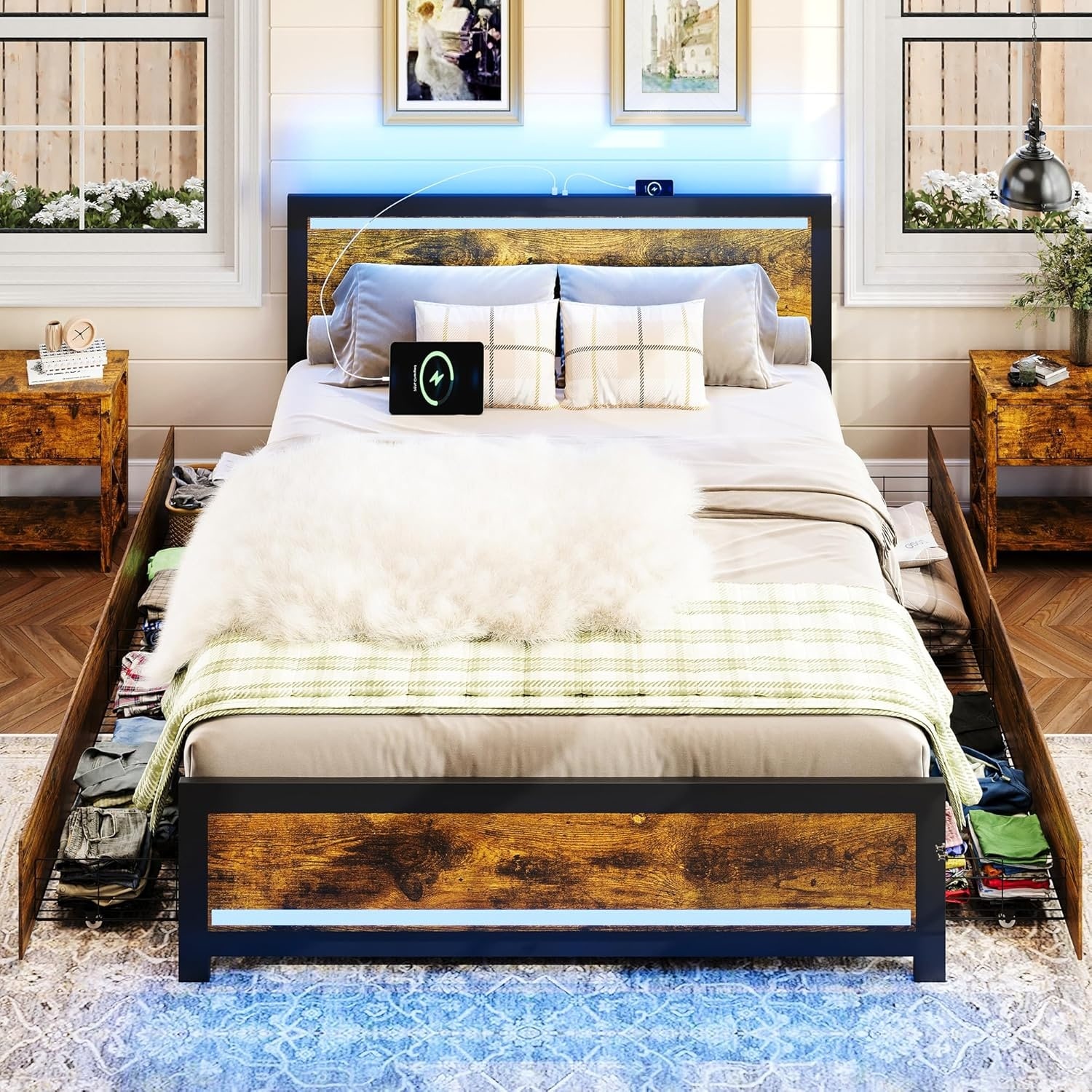 Full Size Platform Bed Frame with Storage Drawers, LED Headboard, USB Charging Station, No Box Spring Needed, Rustic Brown