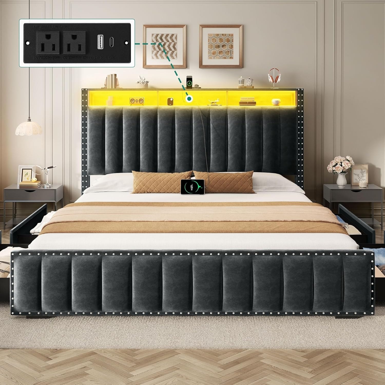 King Size Bed Frame with Storage Drawers, RGB LED Lights, Charging Station, and Noise-Free Design