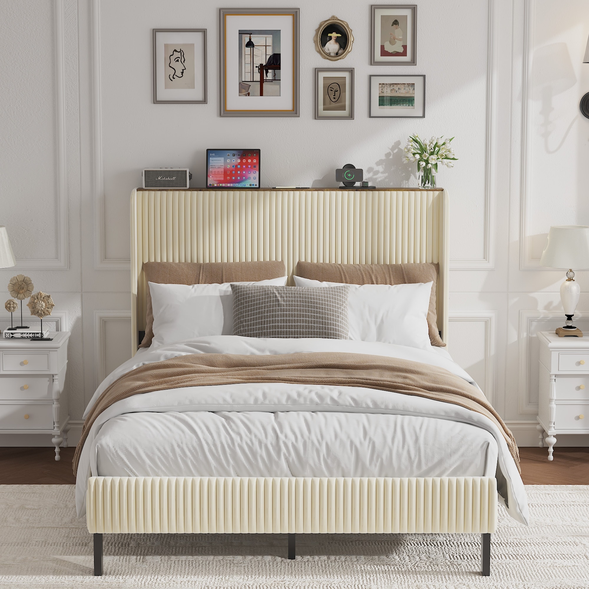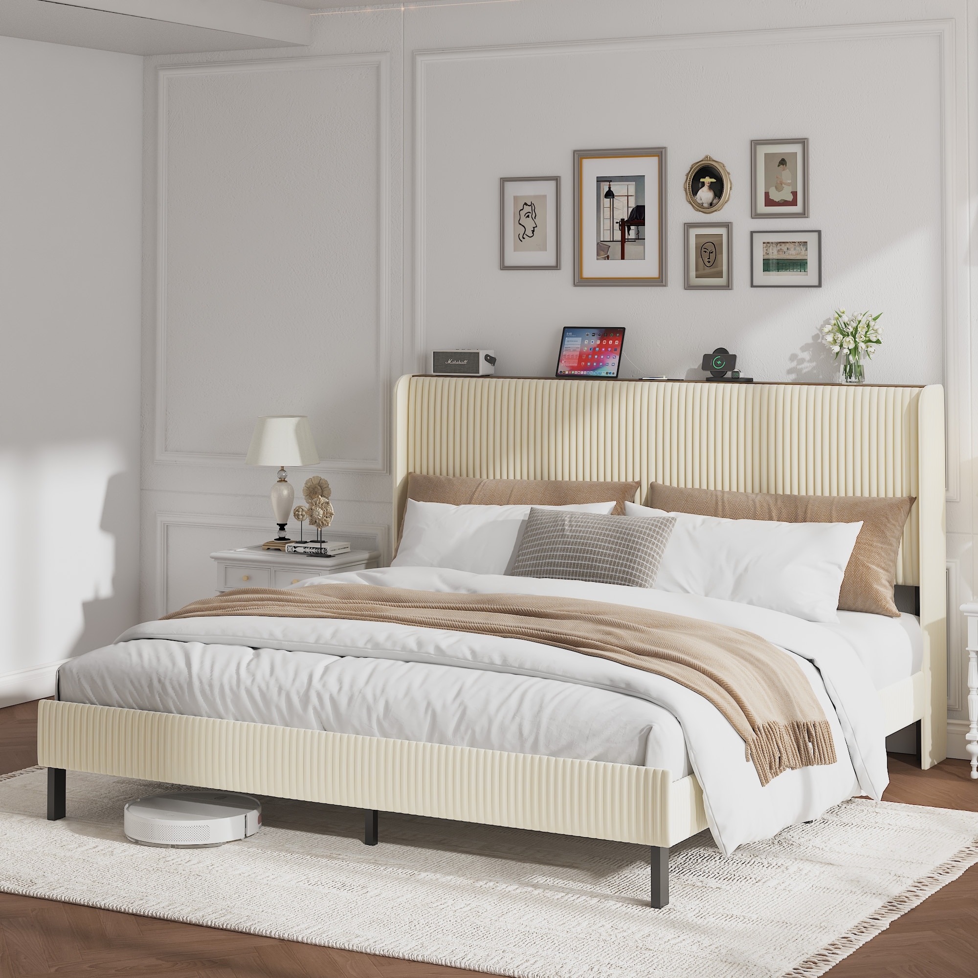 Roomfitters Metal Platform Bed Frame with Charging Station, Heavy Duty Mattress Foundation, No Box Spring Needed, Beige