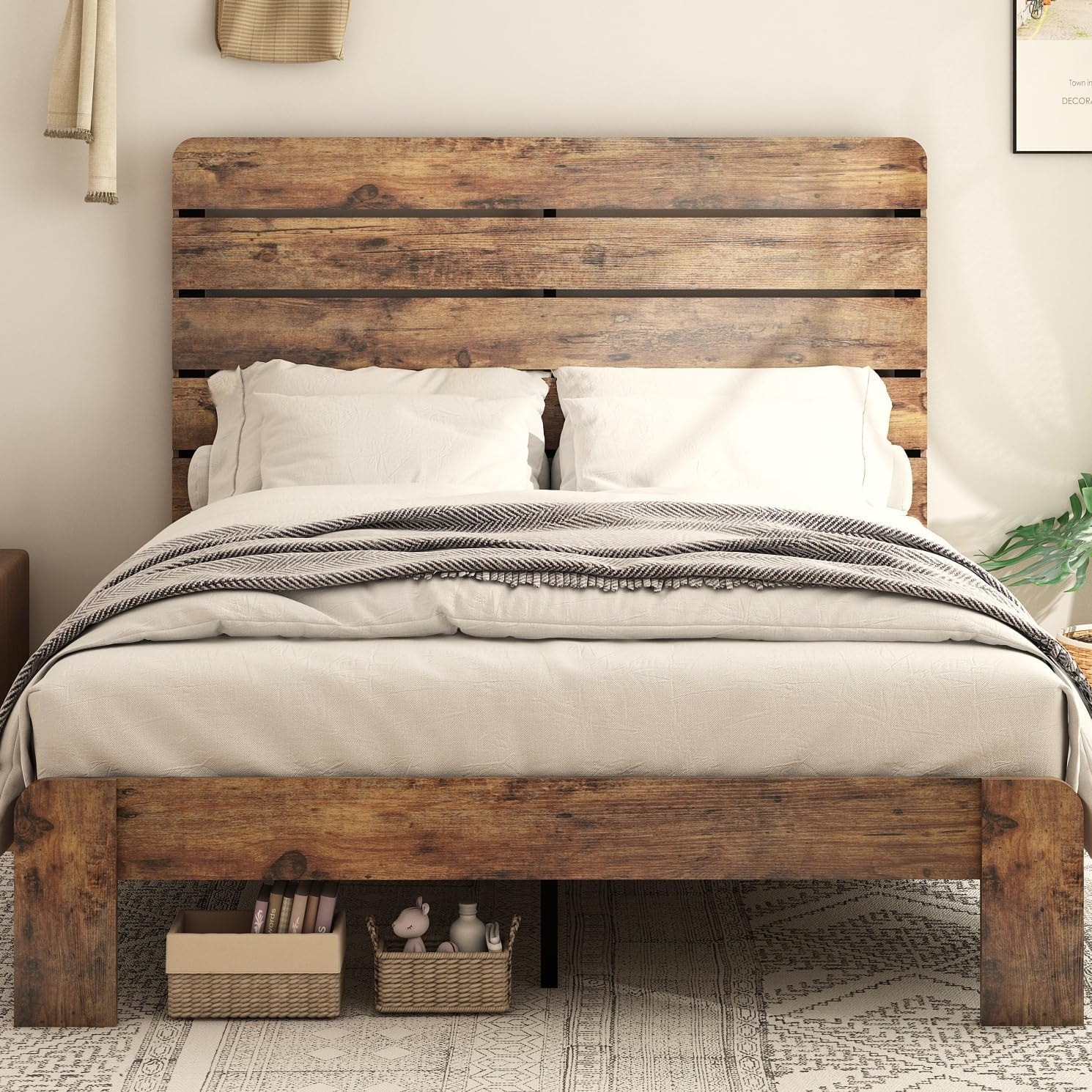 Rustic Farmhouse Wooden Full Size Bed Frame with Headboard, Sturdy Platform Bedframe, Noise-Free, Easy Assembly