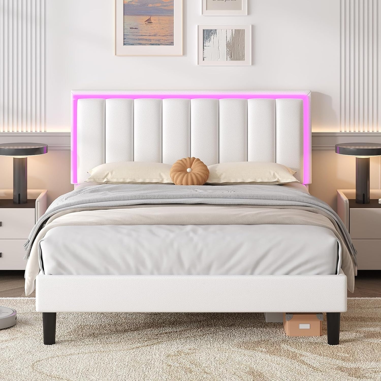 Queen Bed Frame with LED Lights, Upholstered Headboard, Faux Leather, Modern Style, Easy Assembly, White
