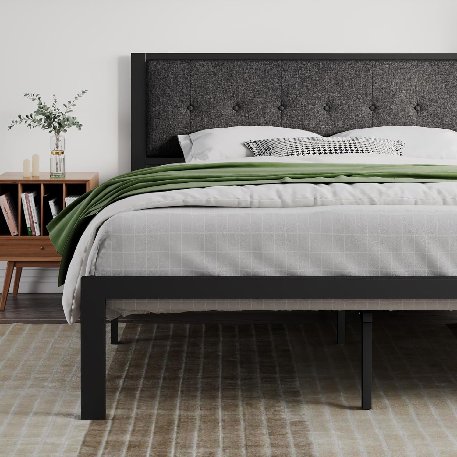King Size Platform Bed Frame with Upholstered Headboard, Metal Slats, Noise Free, Easy Assembly, Dark Grey
