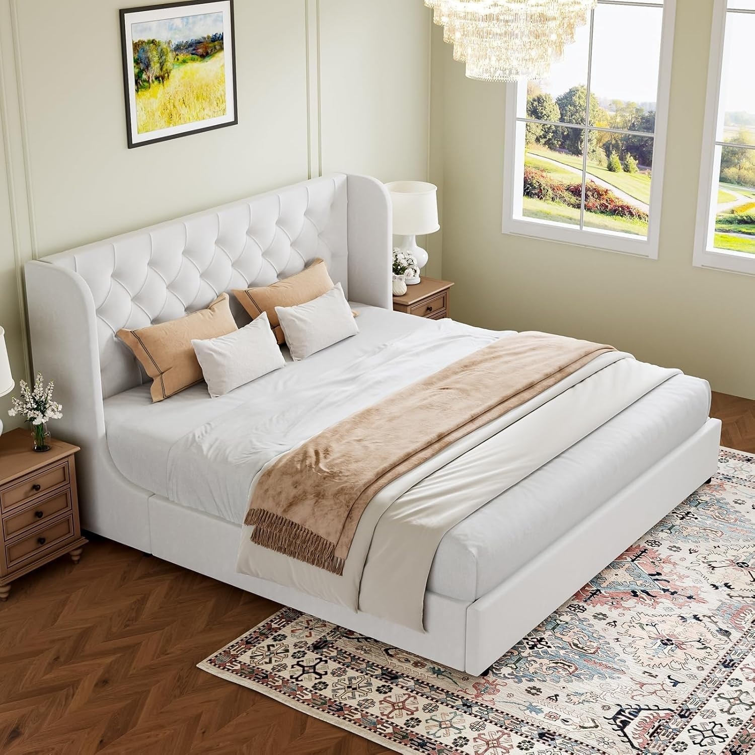White Velvet Upholstered King Bed Frame with Wingback Headboard, Wooden Slats, Noise-Free, Easy Assembly