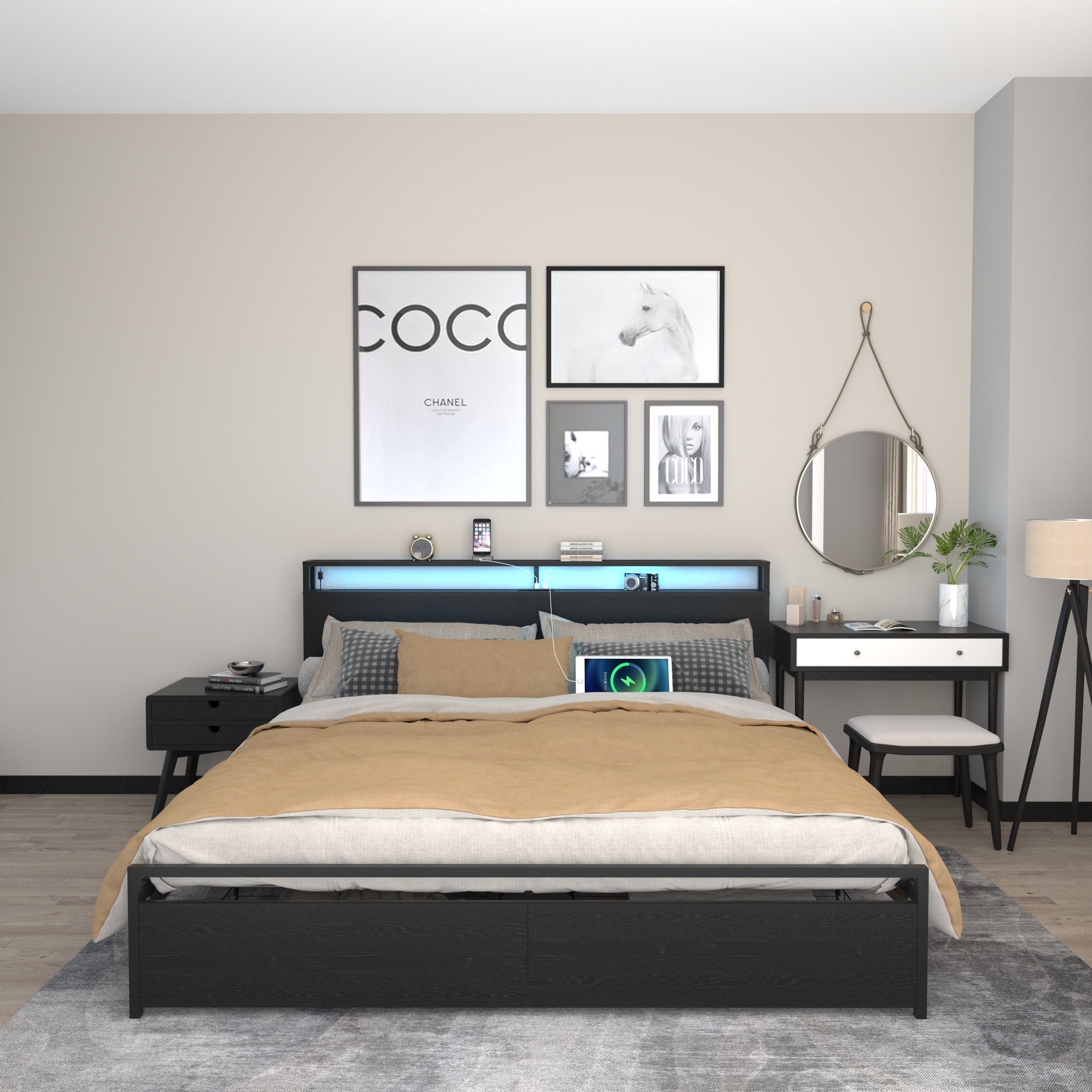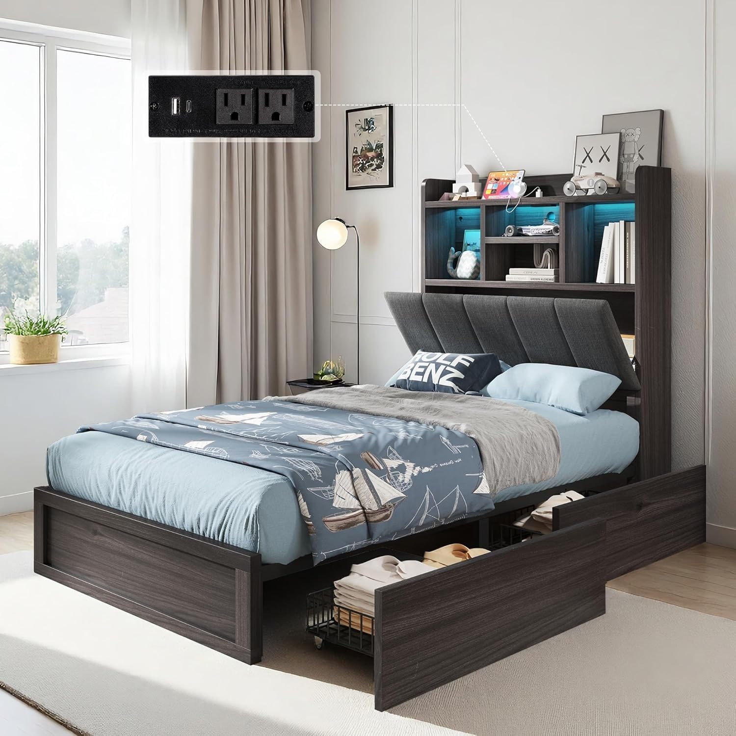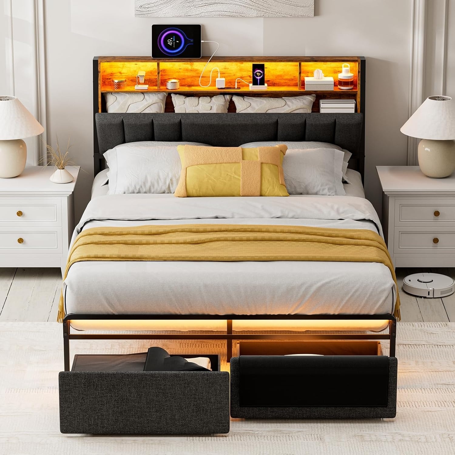 Queen Bed Frame with Storage Drawers, LED Lights, Charging Station, Dark Grey