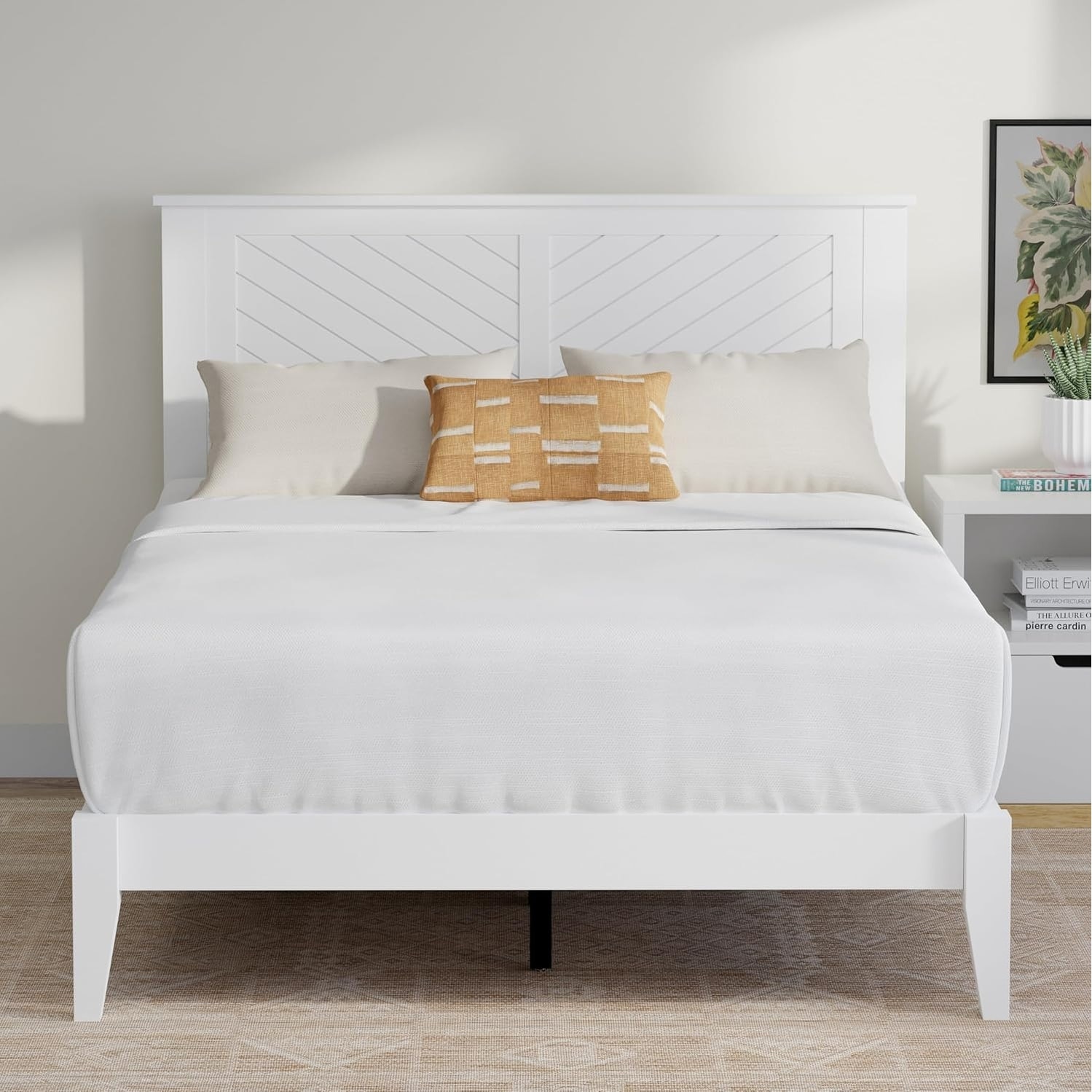 Serene Farmhouse Full Size Wood Bed with Chevron Headboard, Coastal Design, Easy Assembly, White Finish