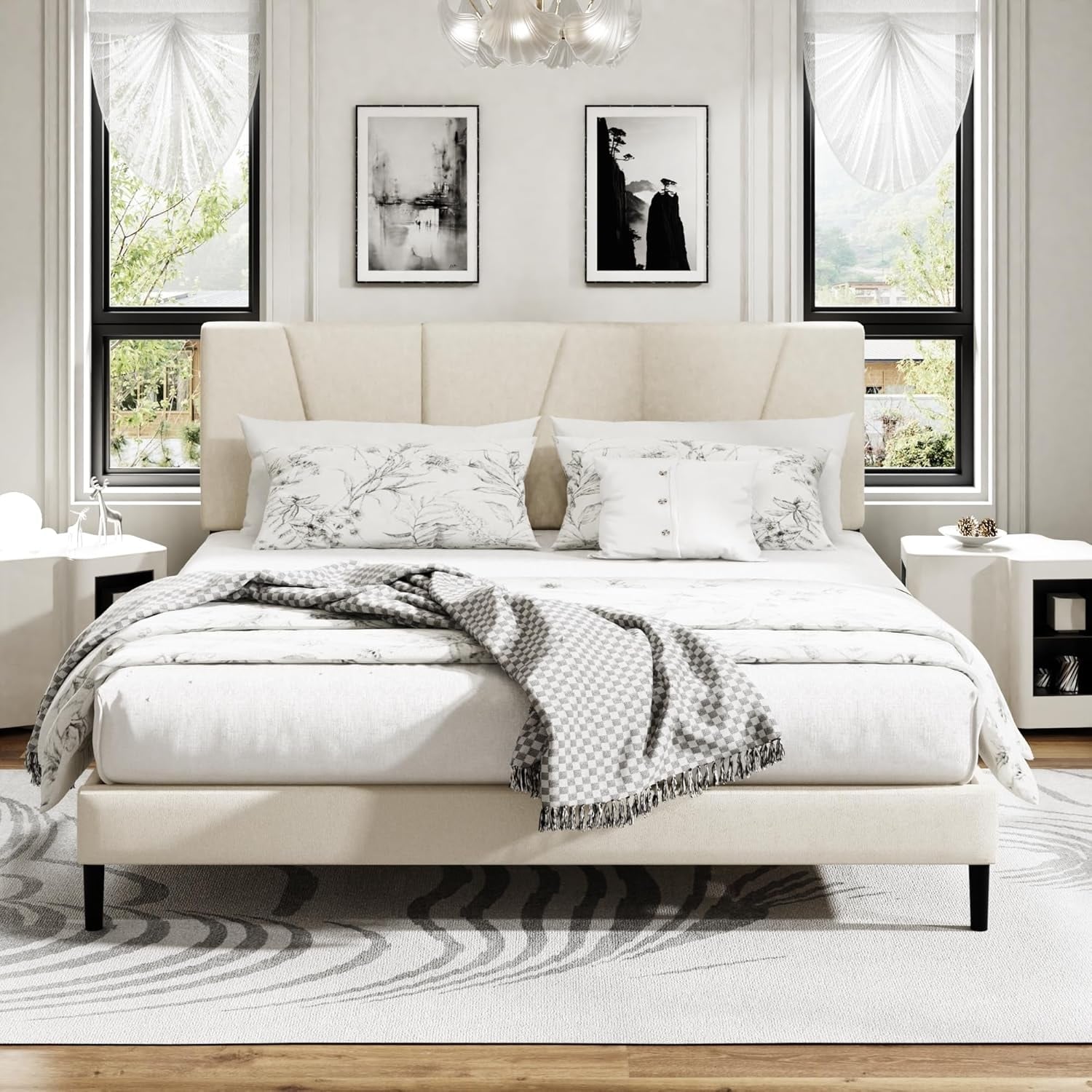 King Size Velvet Platform Bed Frame with Geometric Headboard, Wooden Slats, Noise Free, Easy Assembly, Beige