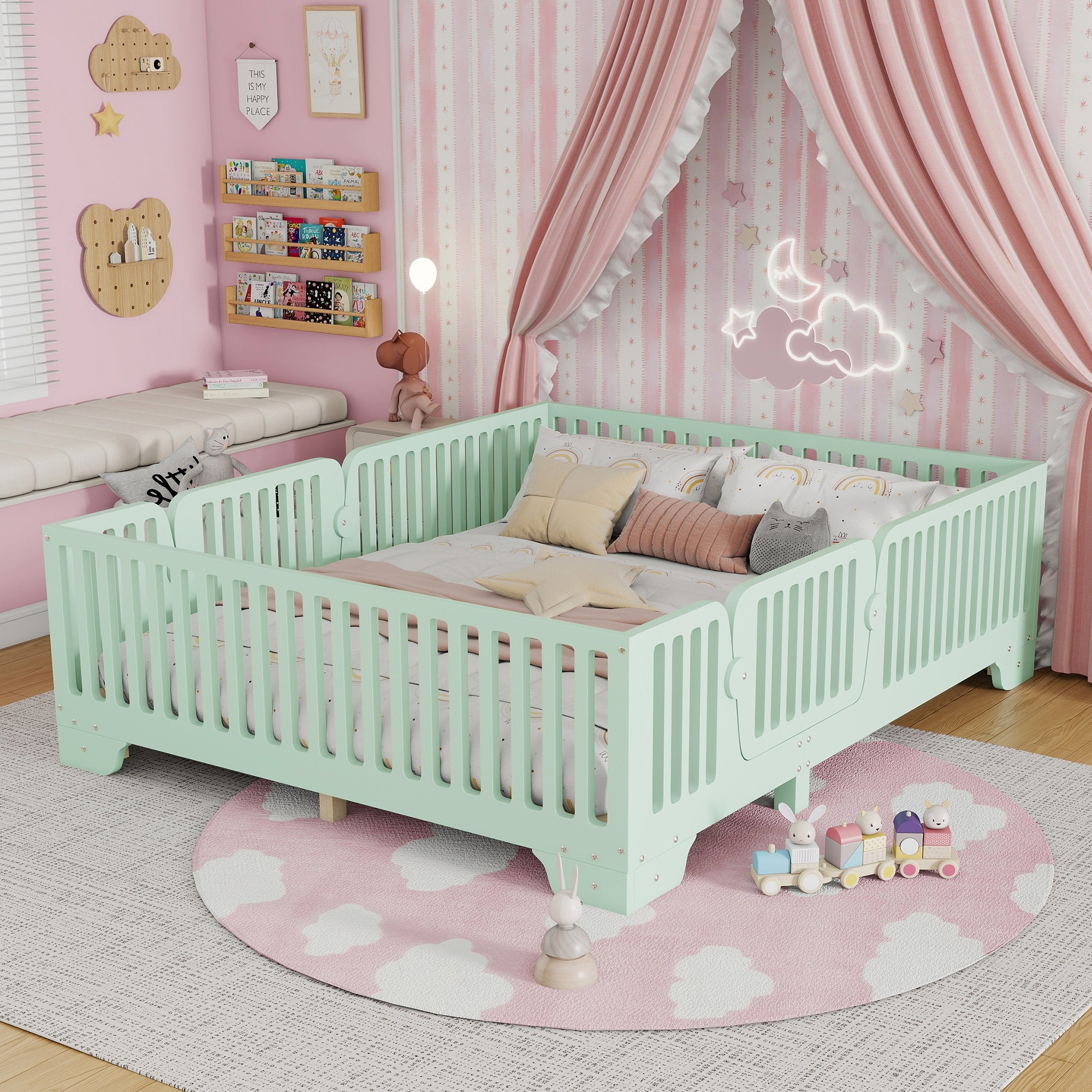 Full Floor Bed with Slats and Fence, Full Size Floor Beds with Door, No Box Spring Needed, Mint Green