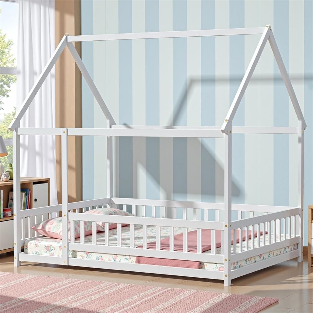 Full Size Floor Bed Frame with Roof Fence, Wooden Montessori House Bed for Boys Girls Bedroom, White Without Slats