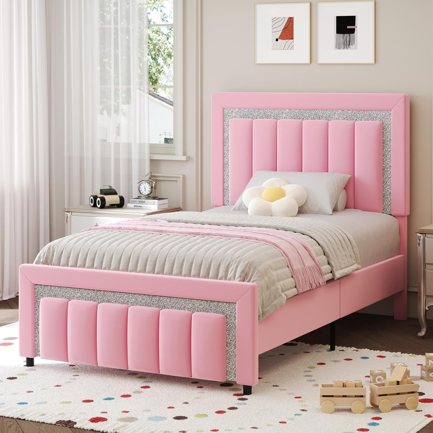 Twin Size Velvet Upholstered Platform Bed with Wooden Slats, Pink, Easy Assembly, No Box Spring Needed