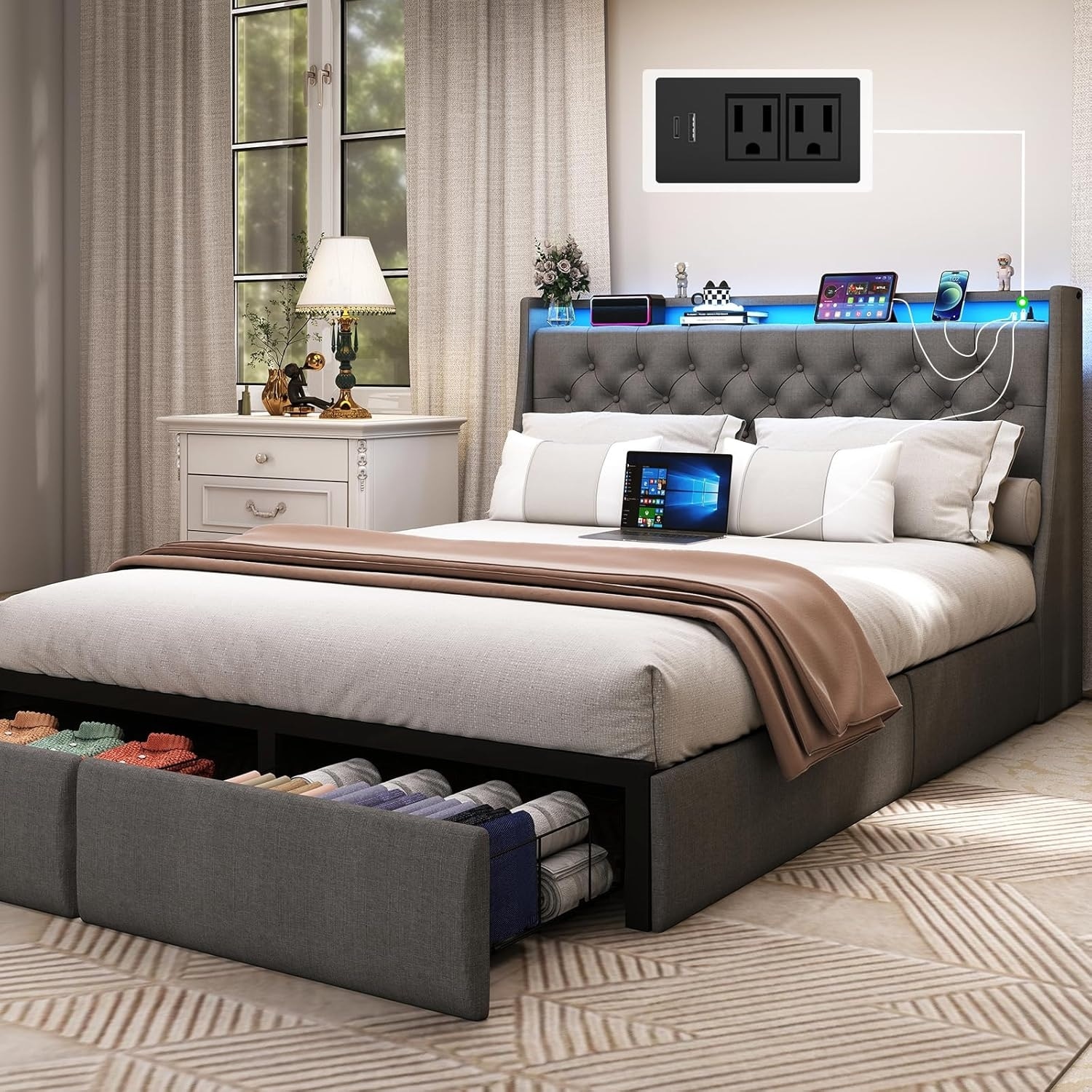 Full Size Upholstered Platform Bed Frame with LED Lights, Charging Station, and Storage Drawers
