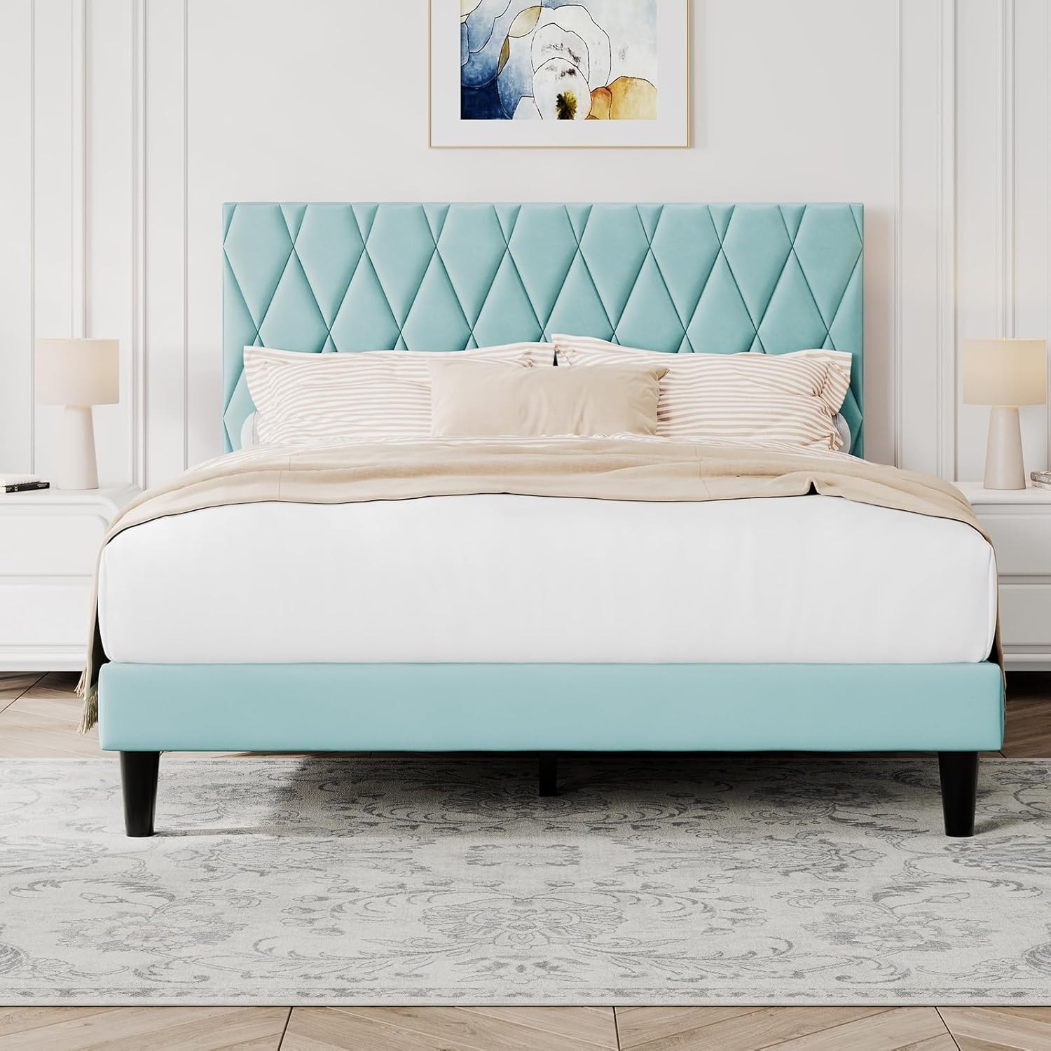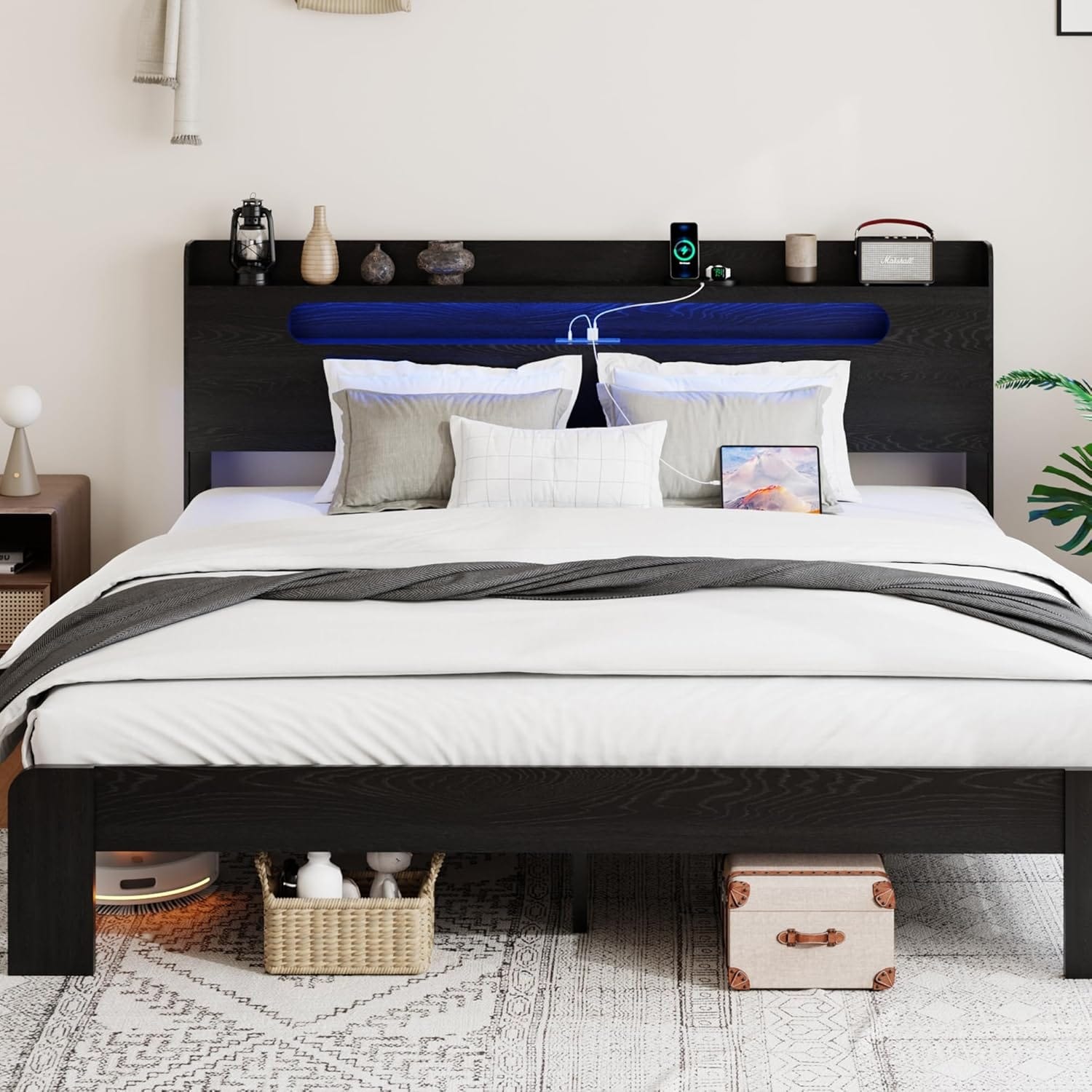 Platform Bed Frame with Storage, Upholstered Headboard, Noise-Free, Easy Assembly, Blue