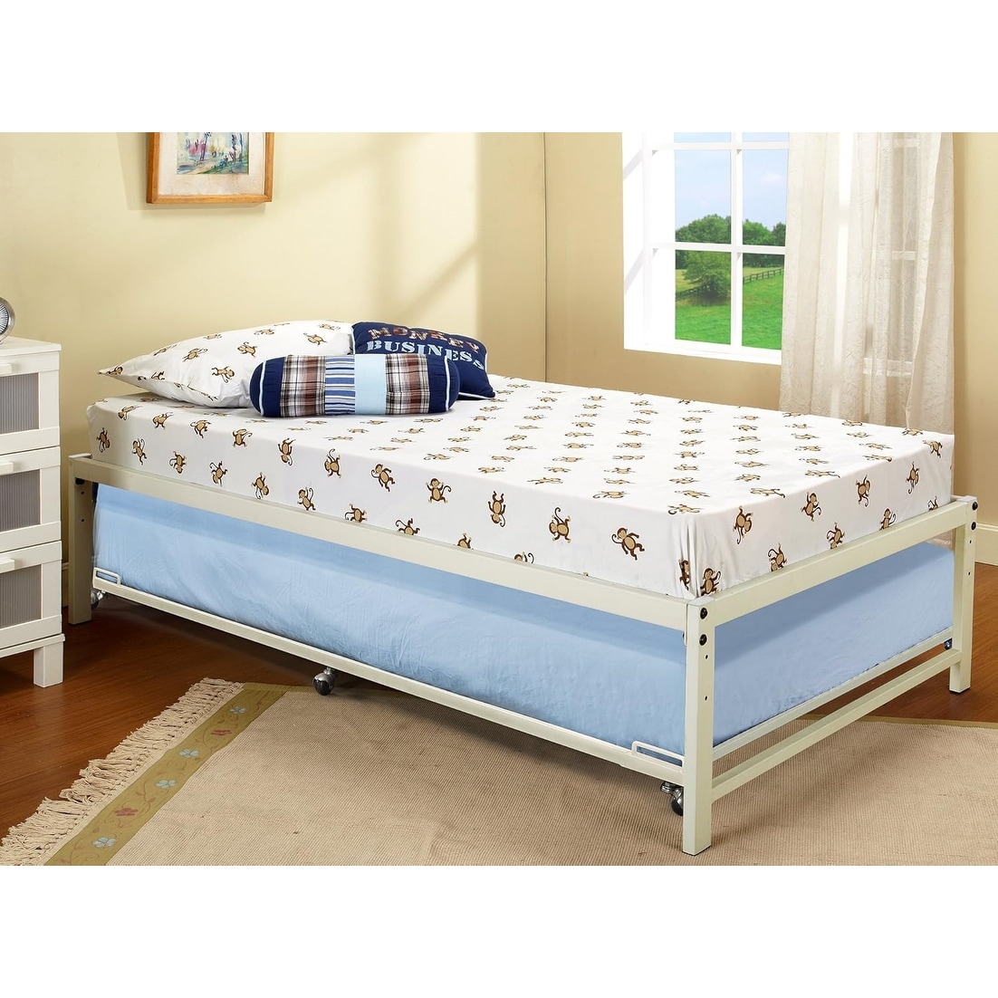 White Metal Twin Size Platform Bed Frame with Roll Out Trundle, No Box Spring Needed