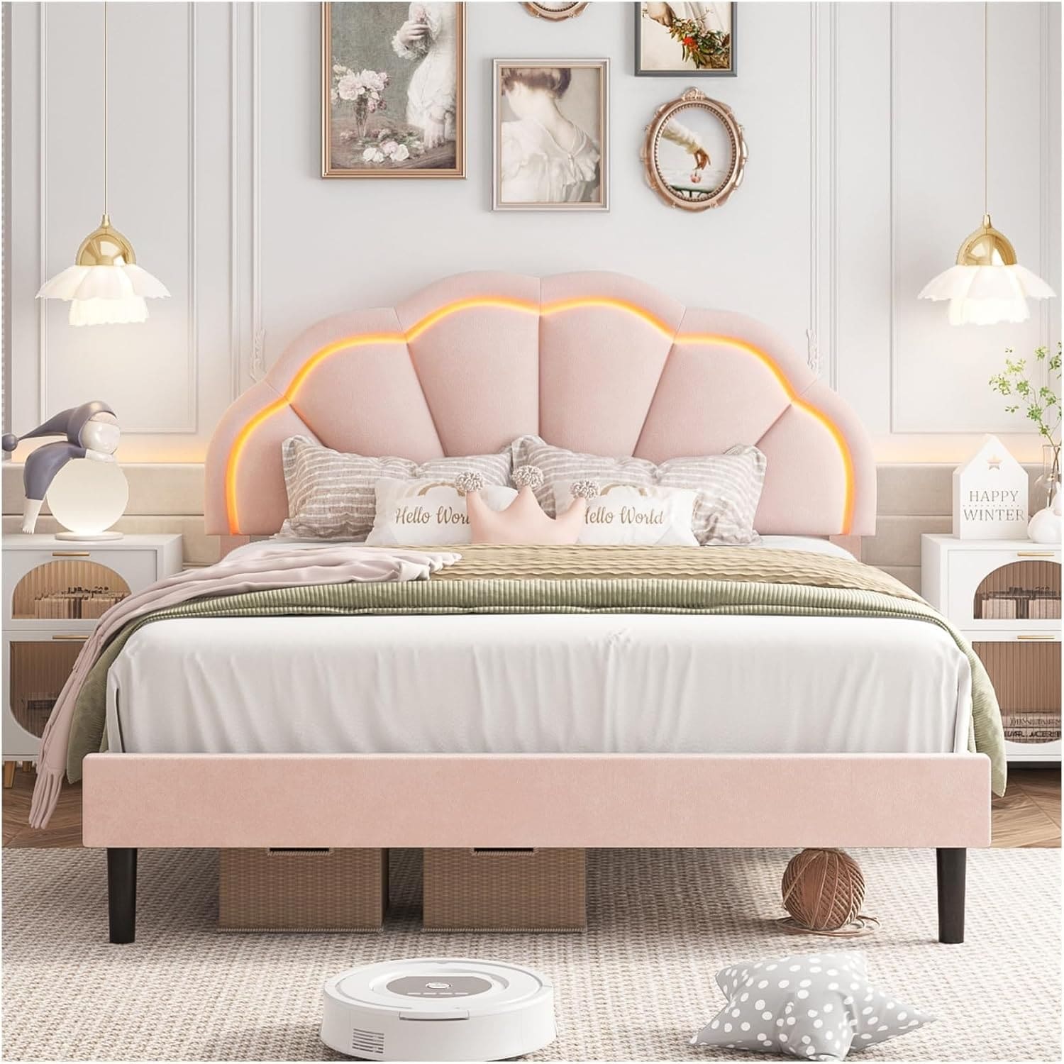 Full Upholstered Smart LED Bed Frame with Adjustable Petal Headboard, Pink