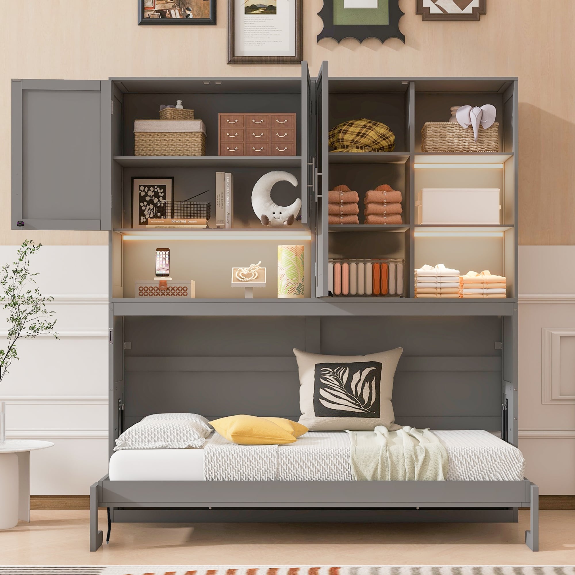 Roomfitters Twin Wall Murphy Bed with Top Cabinet Shelves Space Saving Design MDF