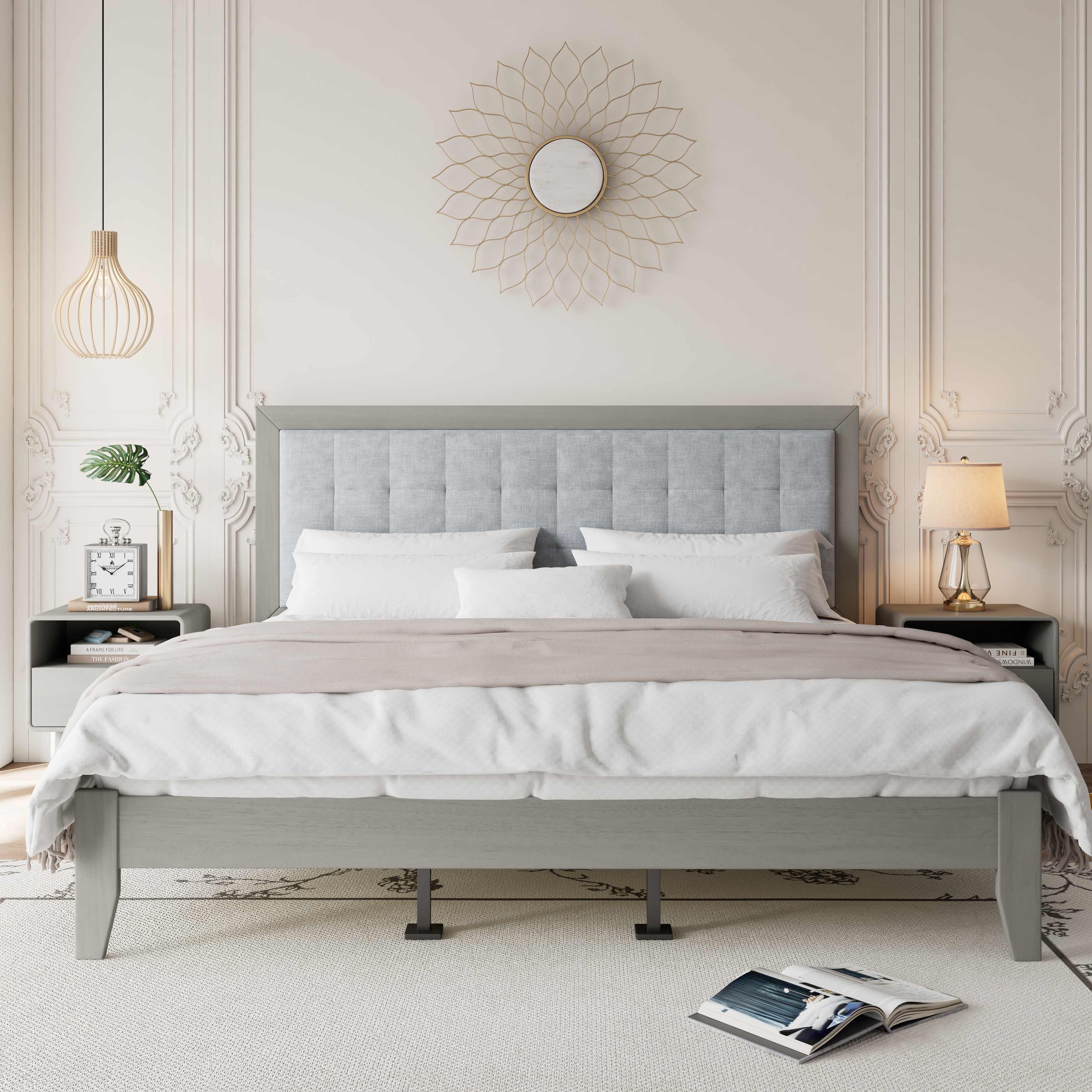 Roomfitters Mid-Century Solid Wood King Platform Bed Frame with Square Tufted Upholstered Headboard and Slats, Grey