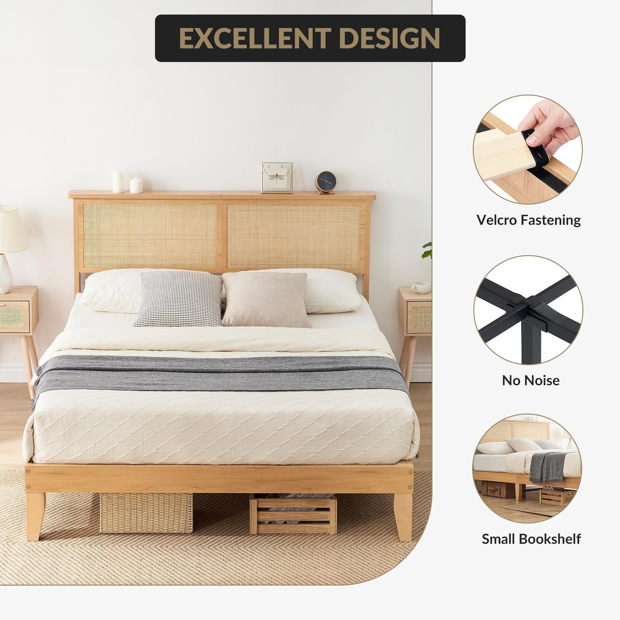 King Size Rattan Bed Frame,Bohemian Rattan Bed Frame King with Natural Headboard, LED Lights,No Box Spring Needed