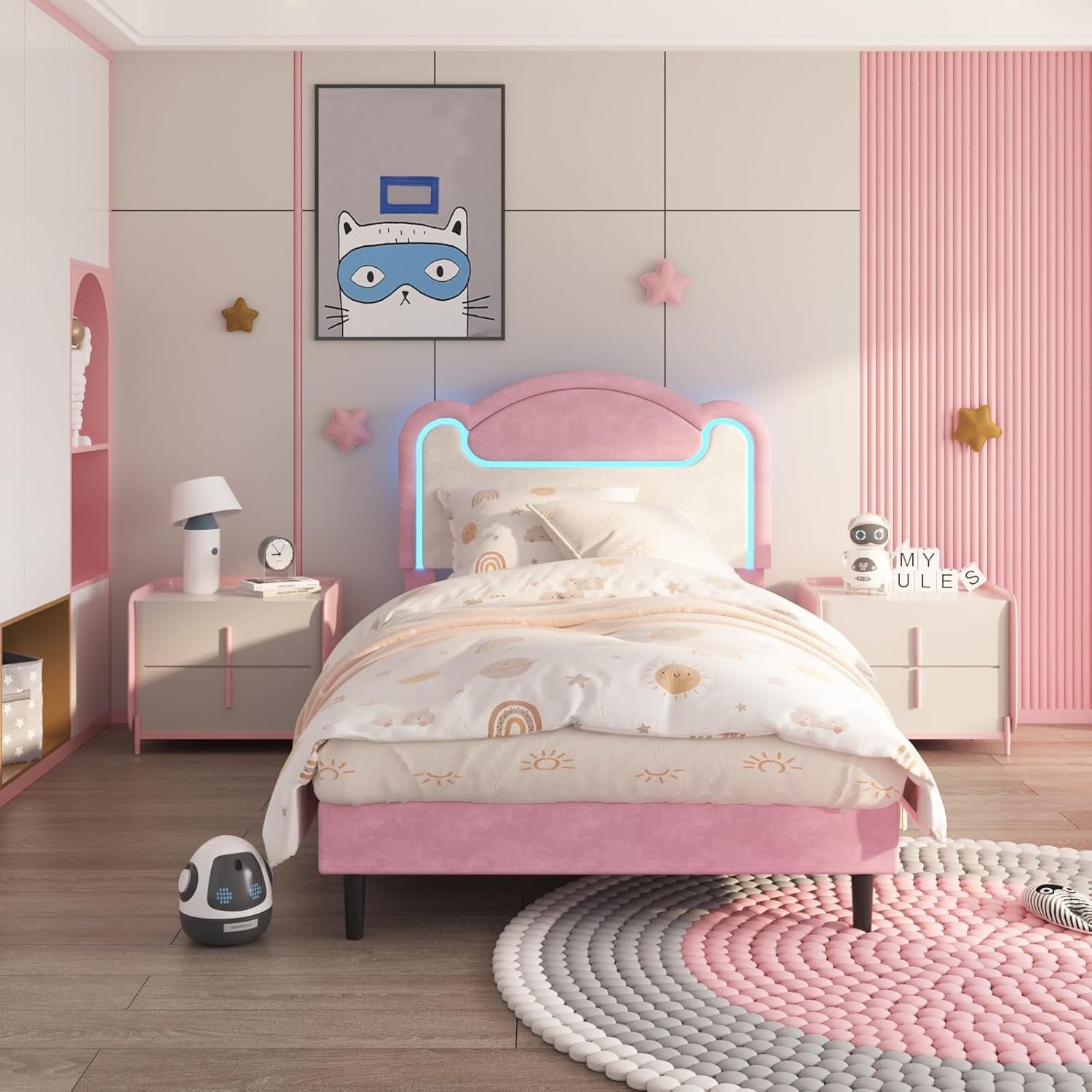Princess Upholstered Bed with LED Lights, Storage Headboard, Drawers & Charging Station, Pink Velvet Platform Bed for Girls